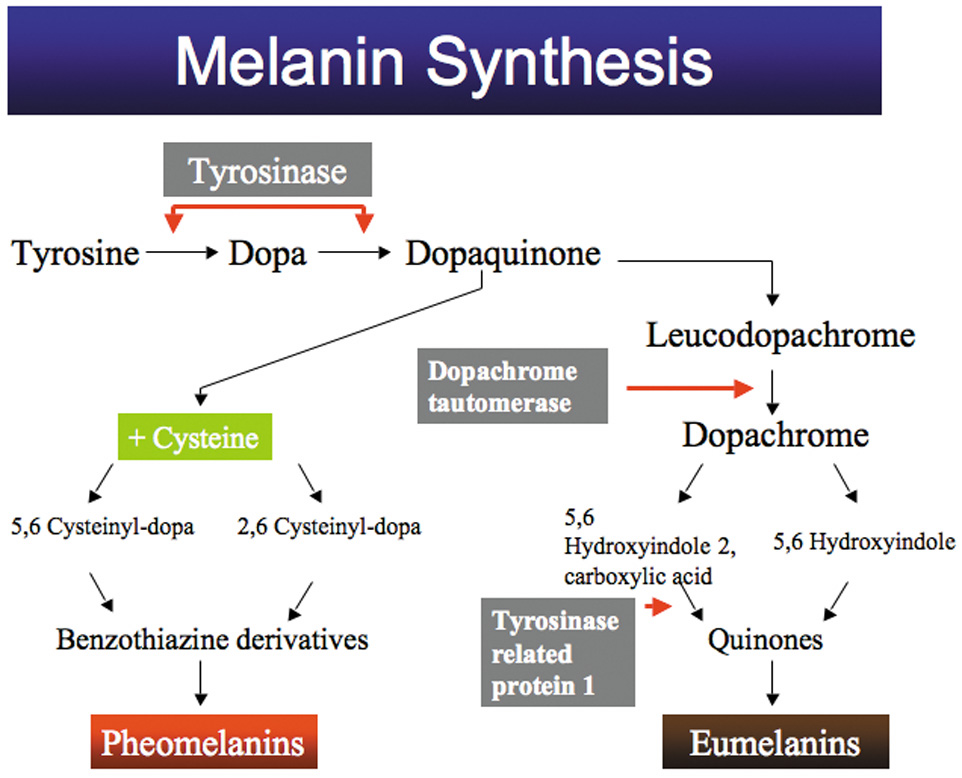 Melanin synthesis (Fig. 1) starts with the amino acid tyrosine, which is oxidized to dihydroxyphenylalanine (DOPA) by the enzyme tyrosinase. DOPA is then