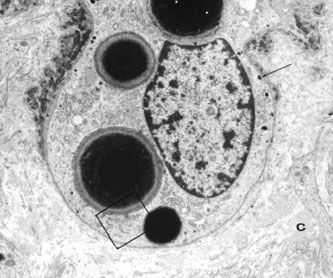 In contrast to OCA, in which pigmentary dilution is due to inadequate melanization of melanosomes, pigmentary dilution in OA appears to be caused by abnormalities in melanosome synthesis resulting in a lower than normal number of melanosomes. The melanosomes that are produced can become fully melanized. Although there is ample clinical and some histopathologic evidence of cutaneous pigmentary dilution in the X-linked form of OA, the cutaneous manifestations are relatively mild. It seems that the eye (especially the RPE) is more severely affected than the skin in OA because melanogenesis within the ocular pigment epithelium occurs for a limited period of time.90,91 Clinically, some patients with Nettleship-Falls X-linked OA (especially blacks) are distinguished from patients with the other forms of albinism by the presence of congenitally hypopigmented cutaneous patches and macules.83,85 The pathogenesis of these patches is unknown. One white male was noted to have areas of slate gray discoloration of the skin, similar to those described more commonly in Chédiak-Higashi's syndrome. These patches appear to be due to excessive amounts of pigment within macrophages in the dermis.85 Histopathologic examinations of clinically normal skin in affected males and carrier females,83,85 and the ocular pigment epithelia (Fig. 11) of two male patients with X-linked OA85,92 revealed the presence of abnormally large melanosomes in addition to normal-sized melanosomes. In a study by Charles and associates,89 all affected males and 84% of obligatory carriers had macromelanosomes. Families in which both patients and carriers lacked macromelanosomes have also been reported.93 Although it is difficult to quantify melanosomes in skin and hair because these melanocytes are incontinent (i.e., their melanosomes are exported to adjacent cells), the number of melanosomes of any size in ocular pigment epithelia is definitely reduced in Nettleship-Falls X-linked OA.85,92 Electron microscopy of the skin, hair bulbs, and fetal pigment epithelia has shown both ultrastructurally normal melanosomes and abnormal melanosomes. The latter have a granular substructure and are spherical. They become fully melanized and can be very large. The cutaneous macromelanosomes are not pathognomonic of X-linked OA because they also occur in the clinically normal skin of patients with neurofibromatosis94,95 and xeroderma pigmentosum.96 Macromelanosomes or melanin macroglobules are thought to represent autophagolysosomes that contain varying numbers of melanosomes.97 They are present in fetal pigment epithelia as early as 22 weeks.92 Although the macromelanosomes are dopa-oxidase- and tyrosinase-positive, there is no proof that they contain normal melanin. Pigmentary dilution in X-linked OA may be due to reduced numbers of normal melanosomes. Some authors, however, have suggested that it is probably a disorder of pigment distribution and/or transfer rather than a primary disorder of production.93