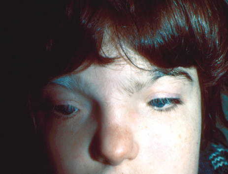 In the following section the salient clinical features of the various types of albinism are discussed. TYROSINASE-POSITIVE OCA (OCA2) OCA2 is the most common form of albinism. It is clinically differentiated from tyrosinase-negative albinism or OCA1A by the presence of some pigment in the hair, skin, and eyes of all patients beyond infancy (Fig. 3). Pigmented nevi and freckles develop around the age of 5 to 6 years. There is susceptibility to basal cell and squamous cell carcinoma of the skin, and cutaneous malignant melanoma has been reported in a few cases.56,57 Electron microscopy reveals lightly melanized melanosomes in the skin and hair of older patients. Infants with OCA2 may be clinically indistinguishable from those with OCA1A, but they acquire pigmentation with age. The hair bulb incubation test or mutation analysis of the tyrosinase and P genes can help differentiate the two disorders in infancy. Mutations in the P gene in patients with tyrosinase-positive OCA suggest that at least in some patients, albinism is due to a decreased availability of tyrosine in the melanocytes because of a problem in its transportation into the cell.58,59 The P protein is thought to be important in the transport of tyrosine. In the mouse, the p (pink-eyed dilution) mutation results in albinism. OCA2 maps to 15q11.2-q12, a region associated with Prader-Willi's and Angelman's syndromes, both of which are characterized by hypopigmentation in addition to dysmorphic and developmental abnormalities.60,61 TYROSINASE-NEGATIVE OCA (OCA1) OCA1 is the second most common type of OCA. Patients with OCA1 do not have clinically or histopathologically discernible pigmentation. Pigmented nevi and freckles do not occur. Electron microscopy of the skin and hair reveals no melanization of melanosomes. In vitro hair bulb incubation in L-tyrosine does not produce melanin. There is a total absence of tyrosinase enzyme activity. In a study of tyrosinase gene mutations, Tripathi and co-workers62 concluded that in Caucasians OCA1 results from a great variety of uncommon alleles. About 90% of the patients in their study had a total of 29 mutations, and 80% of missense substitutions were clustered in two relatively small regions of the tyrosinase polypeptide. Not surprisingly, in Tripathi et al's study, six of 17 patients who were initially classified as having tyrosinase-positive OCA had mutations in the tyrosinase gene. Several other review studies of mutations in the tyrosinase gene have been published.63–66 YELLOW OCA Clinically, this form of OCA is characterized by yellow hair with a reddish cast in older patients.67,68 Of the different subtypes of albinism known today, the yellow-mutant form (or yellow albinism, as suggested by King, who stated that such albinos are offended by being called mutants) is probably the most difficult to diagnose as such, especially in younger individuals. For example, white infants with yellow albinism may be clinically indistinguishable from tyrosinase-negative oculocutaneous albinos. In contrast, blacks (especially adults) with yellow OCA have dark cream-colored skin and light red hair, and therefore may fall within the normal range of pigmentation for American blacks of mixed racial ancestry. Thus, the yellow form of OCA in blacks could clinically be confused with OA. Laboratory studies are often necessary to establish the diagnosis of yellow OCA. In contrast to the results of electron microscopy studies of hair and skin in OA, the hair and skin in yellow OCA reveals incomplete melanization of melanosomes. Also, in contrast to OA or tyrosinase-positive OCA, the hair bulb incubation test is negative or only weakly positive. Moreover, the addition of L-cysteine to the incubation medium results in some increased pigmentation. Spritz and associates69 identified a proline-to-leucine substitution at codon 406 of the tyrosinase gene as the cause of yellow OCA. TEMPERATURE-SENSITIVE ALBINISM In this variant of tyrosinase-related OCA, as described by King and colleagues,70,71 some pigmentation develops in the hairs of cooler or exposed parts of the body. Axillary hair is white, whereas pubic hair and leg hair are darker. There is an absence of ocular pigment. Giebel and co-workers72 found an arginine-to-glycine substitution at codon 422 in one family with this condition. In vitro introduction of the codon 422 mutation resulted in thermosensitivity of tyrosinase with 28% activity at 31°C, and only 1.4% activity at 37°C. BROWN OCA (ALBINISM WITH ONLY MODERATE REDUCTION OF PIGMENT) Black individuals with brown OCA have light brown skin, light brown hair, and blue-to-brown irides associated with nystagmus and reduced visual acuity. This disorder was first described in Enulu Nigerians and was further characterized in African-Americans.73–75 Brown albinism is the human homologue of brown (b) mutant mice with a brown rather than black coat color.76,77 The cDNA of the b gene was found to be different from that which codes for tyrosinase.78 However, because of its similarities to tyrosinase, the protein 5,6-dihydroxyindole-2-carboxylic acid (DHICA) was termed “tyrosinase-related protein” and the gene was called TYRP. This protein catalyzes a distal step in the eumelanin biosynthetic pathway. Human TYRP was mapped to 9p22-p23.79,80 To date, no mutations in the human TYRP gene have been identified. Two patients with a deletion of 9p and hypopigmentation have been reported.81 RUFOUS OCA (XANTHISM) Walsh82 described this type of OCA in New Guinea indigenes in 1971. The skin of affected children appeared red and became reddish brown with age. Walsh mentioned briefly that some patients were photophobic and had nystagmus, but did not provide details regarding the ocular examination. NETTLESHIP-FALLS X-LINKED OA X-linked OA occurs with a frequency of about 1:150,000 live male births. Cutaneous pigmentation typically falls within the normal range. The hair bulb incubation test is positive for tyrosinase.