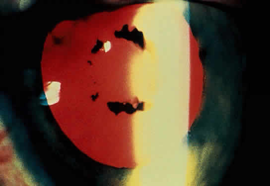 Ocular inflammatory changes include conjunctivitis, episcleritis, keratitis, acute and chronic iridocyclitis, and posterior changes as well.38–43 The acute iridocyclitis is milder and frequently not accompanied by as much pain, photophobia, and redness as in the acute iridocyclitis associated with other spondyloarthropathies. Mild injection of the conjunctival and episcleral vessels and blurred vision may be the only symptoms of an acute flare of activity. The endothelium of the cornea usually has cellular debris and poorly formed keratic precipitates in the lower cornea. The anterior chamber contains cells and moderate flare, and a protein clot is not infrequent in the pupil, with early formation of posterior synechiae (Fig. 6); however, the synechiae are usually more easily broken than in ankylosing spondylitis and Reiter's syndrome.44 Treatment with topical corticosteroids and mydriatics is usually effective. The activity of the iridocyclitis has been reported to follow the activity course of the inflammatory bowel disease. Systemic treatment of inflammatory bowel disease has been noted to help the ocular inflammation. Decreasing the systemic treatment occasionally allows ocular inflammation to become visible and requires close observation and appropriate increase in local therapy.39,44–46 Surgical resection of inflamed bowel for other medical reasons has sometimes been reported to coincide with lessening of ocular inflammation,44,46 but these observations need better evaluation.42 Posterior segment manifestations, including retinal and choroidal vascular disease, are also sometimes noted.47,48