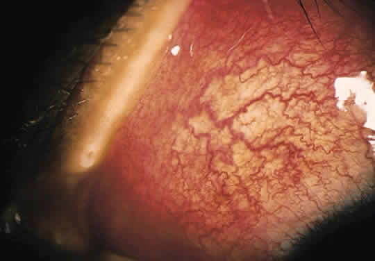 is usually the predominant manifestation in these systemic diseases. The anterior symptoms and findings may be of acute onset. The conjunctiva and episclera are mildly injected. The cornea has scattered endothelial cellular debris with little tendency to form keratic precipitates. Severe ischemia may be accompanied by diffuse episcleral hyperemia, hypotony, corneal edema, and wrinkles in Descemet's membrane. A few cells and flare are present in the anterior chamber, unless the vascular supply has been dramatically obstructed, in which case the anterior chamber reaction will be more severe. There is a tendency for posterior synechiae to occur. The iris may be poorly reactive and may not dilate well with mydriatics. Keratopathy, hypotony or glaucoma, pupil dilation, iris atrophy, and neovascularization (rubeosis irides) are sometimes seen. Symptoms of amaurosis fugax and pain without photophobia may be present. Vision may be decreased more than expected from the clinical findings. The anterior vitreous usually also contains cells and debris with little tendency toward clumping.105 Diagnosis is usually suspected from the history of extensive anterior segment vascular supply injury, the clinical appearance of anterior segment reaction, or in the case of other causes of vascular occlusion, from the accompanying posterior segment disease, systemic symptoms, and history. An erythrocyte sedimentation rate should be obtained on an emergency basis for anyone having suspected giant cell arteritis (cranial arteritis or temporal arteritis) or polymyalgia rheumatica. The diagnosis should be clarified immediately, and if the diagnosis can be substantiated, treatment should probably be started with systemic corticosteroids without delay. This diagnosis probably should be made in cooperation with an internist and as quickly and firmly as possible on the basis of a tissue diagnosis (if indicated), elevated sedimentation rate, compatible clinical course, and associated findings.106,107 Additional consideration should be given for other causes of vasculitis or vascular occlusive disease, including evaluation for diabetes, antinuclear antibody, blood pressure evaluation, carotid flow studies for carotid occlusive disease, auscultation of the neck vessels for a bruit, and a good general medical evaluation for any additional systemic disease.108 |