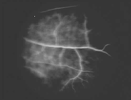 If inflammation is prolonged, secondary changes such as thickening of the vein wall and endothelial cell proliferation may occur. These can lead to narrowing and obstruction of the lumen, thrombosis, and necrosis. Other late changes secondary to vascular occlusion include telangiectasia, microaneurysms, and neovascularization.21 Histopathologically, polymorphonuclear leukocytes are the predominant cell type early in the disease, but lymphocytes accompanied by an occasional plasma cell, giant cell, or epithelioid cell become the predominant cell types later in the disease.25 Fluorescein angiography often reveals focal areas of staining or dye leakage even before ophthalmoscopically visible signs are present (Fig. 3). In advanced cases of periphlebitis, angiography may show diffuse leakage of dye from retinal veins and capillaries.26