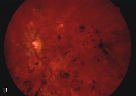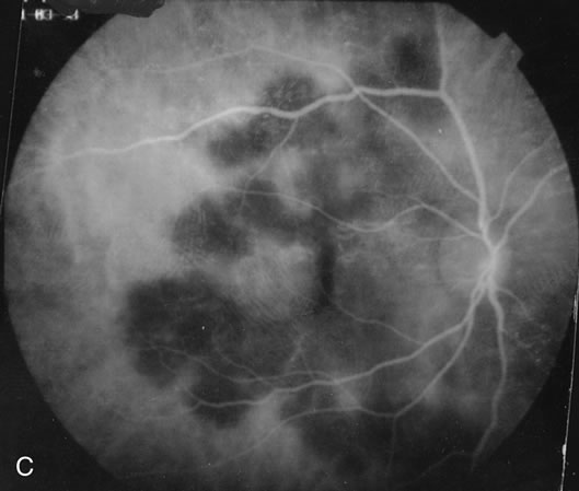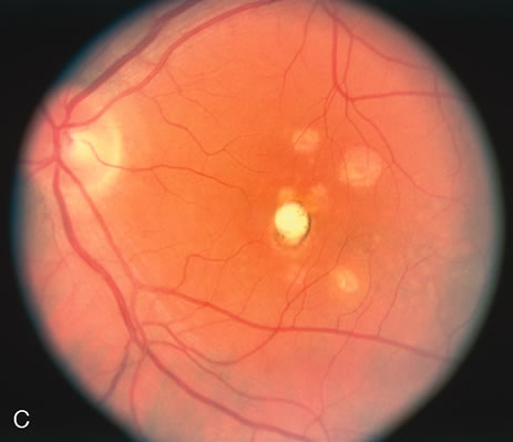 there also is no definite confirmatory determination of this. The reason the diseases are considered infectious is because they appear to cause acute visual loss and some are associated with white blood cells in the vitreous or a retinal vasculitis. In addition, the lesions may crop up and have an acute, chronic, or semiacute course similar to systemic infectious diseases. Many of these entities affect persons in the third to fifth decade of life, which is when many of the immunologic reactions occur elsewhere. It may be that there is an initial infectious agent that in a host with certain predisposing characteristics triggers an immunologic reaction, or it could be that the agent stays indefinitely in the host causing a host-induced reaction. On physical examination, the patients may have iritis, vitreitis, or retinitis, although in many of the choroiditic entities they may not manifest these findings. Because the choroid or the retinal pigment epithelium is affected, they may show a serous retinal detachment that presents as a blister of fluid that is loculated or as an exudative retinal detachment with shifting subretinal fluid. Acutely there may be a gray-yellow plaque of varying size. It may then resolve with only mild almost imperceptible pigmentary changes or there can be dense white chorioretinal scarring. Because the photoreceptor/retinal pigment epithelial complex is affected, many note photopsias or colored swirling lights and also they may have visual field defects. It is important to determine carefully that the disease is truly an inflammatory disease and not a known infectious or neoplastic disease. Infectious choroiditides have to be considered in all circumstances of inflammatory choroiditis. A specific test for Treponema pallidum, for instance, the fluorescent treponema antibody-absorbed (FTA-ABS) test or the microhemaglutination-treponema pallidum test (MHA-TP) should be performed to determine if the choroiditis is caused by syphilis. Other diseases, including tuberculosis, cat-scratch disease, coccidioidomycosis, West Nile encephalitis, and nocardiosis among others need to be considered. In addition, certain noninflammatory diseases, for instance, central serous chorioretinopathy may have an acute time course similar to that of an inflammatory condition and eclampsia, thrombotic thrombocytopenia purpura, and disseminated intravascular coagulation may also mimic an acute inflammatory choroiditis. |