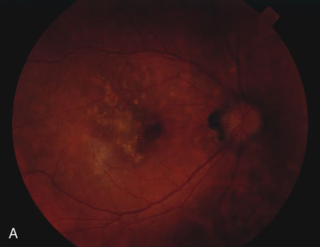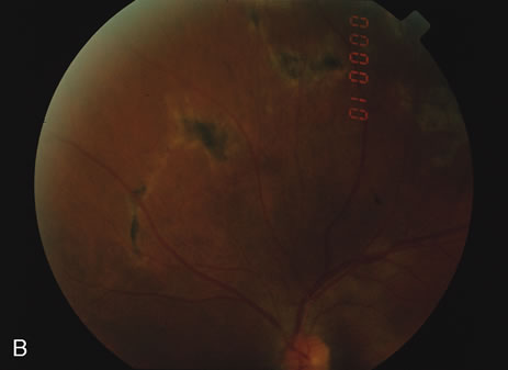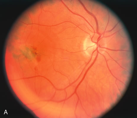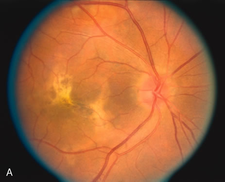 HISTORY AND CLASSIC FINDINGS Presumed ocular histoplasmosis (POH) is probably caused by dissemination of the histoplasma capsulotum after acute exposure to the organism. It is characterized by punched-out chorioretinal lesions, peripapillary scarring, and choroidal neovascular membranes, with no vitreous or anterior chamber inflammation. This disease is seen most often in people who come from the Ohio-Mississippi River Valley area where the fungus is ubiquitously found. Most often patients present in their fourth and fifth decade of life because of the development of a choroidal neovascular membrane. There may be a genetic predisposition and patients that have the HLA-B7 or the HLA-DR2 haplotype may be more susceptible to developing the ocular form of the disease. It is hypothesized that after acute exposure to the organisms by inhalation in susceptible persons, there may be a pulmonary infection associated with symptoms of a lower respiratory tract infection including mild fever and a cough. This elicits a granulomatous response and the organisms are probably destroyed by this cell-mediated response. As opposed to the inflammatory choroiditides, POH tends to be asymptomatic unless there is a choroidal neovascular membrane that is causing visual symptoms. There have been a few cases reported that appear to show that there can be symptomatic exacerbations of the inflammatory component of the choroidal scars. These cases are rare and they appear to respond to corticosteroids. There are also rare cases of intrascar neovascularization that may imitate the exacerbation of inflammation. It is hard to distinguish intrascar neovascularization from a true exacerbation of inflammation because they both show subretinal fluid, the patient is symptomatic in both, and the lesions respond to corticosteroids many times in both cases or at least temporarily in cases of intrascar neovascularization. If there is subretinal hemorrhage, the cause of the symptoms is neovascularization. Once the neovascularization extends to the edge of the scar, then laser photocoagulation or photodynamic therapy should be considered. These intrascar neovascularizations are different from classic cases where the neovascularization begins at the edge of the scar.39 BIOMICROSCOPY Rarely, there are some cases of documented choroiditis associated with histoplasmosis. There are however rare cases and if there is choroiditis, other diagnoses, especially multifocal choroiditis, should be considered. |