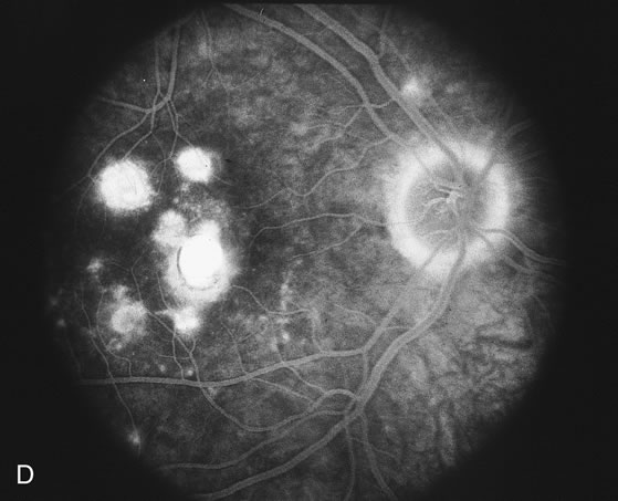 Usually there is resolution of the fundus findings, although careful fundus evaluation sometimes shows some residual fine retinal pigment epithelial mottling. In rare cases, there may be long-standing pigment clumping with surrounding pigment atrophy similar to the lesions seen in multifocal choroiditis or punctate inner choroidopathy although that has been contended. The foveal granularity may take longer to resolve than the white spots. There may be mild optic disc swelling. This may lead someone unfamiliar with this disease to consider that the cause of visual loss is optic neuritis. There also may be mild retinal phlebitis that may be more easily seen by fluorescein angiography than by ophthalmoscopy. Choroidal neovascularization rarely develops.9 ANCILLARY TESTING Fluorescein The fluorescein angiograms of the white dots show a fine halo appearance in a wreath-like swirl configuration to some of the white dots, and this halo diffuses in the later stages of the angiogram, first developing a stippled pattern of fluorescence and then becoming a diffuse white spot that leaks only mildly. There may be leakage of fluorescein from the optic nerve and occasionally, there may be late staining of retinal vessels because of a mild vasculitis (Figs. 3 and 4).
