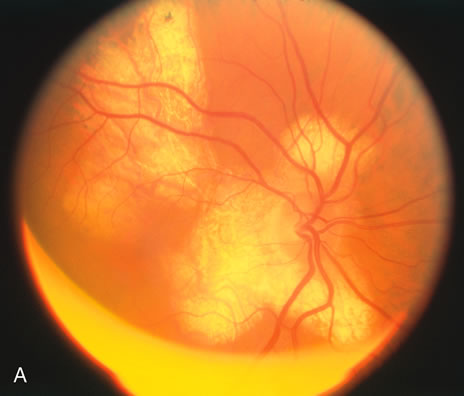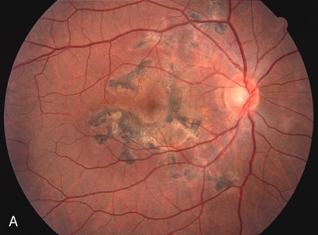 HISTORY AND CLASSIC FINDINGS Hong and associates100 described a group of six young patients who had visual loss because of an inflammatory lesion of the choroid that was yellowish-white. The patients were otherwise healthy. The average age of the original group of patients was 17.5 years; four were males. The initial visual acuity ranged between 20/30 and counting fingers vision. Only one patient had iritis and vitreitis. The choroidal lesion measured between 0.75 and 1.5 disc diameters. In some cases there was an overlying neurosensory detachment. The diminution of vision was related to the distance between the fovea and the choroidal lesion. There were subretinal hemorrhages in a few cases. Fluorescein angiography showed leakage with late staining of the inflammatory lesions. With resolution, the vision improved. There was pigmentary clumping noted as resolution began and ultimately the lesion became a white chorioretinal scar with some subretinal fibrosis. Recovery time took up to 6 months, and in one case, there was a relapse. One case developed a choroidal neovascular membrane at the edge of the helioid lesion. These cases may be caused by a small choroidal granuloma. One case reported by Pollock and Kristinsson101 of a 20-year-old man with a lesion that appeared similar in size and coloration had serologic evidence for cat-scratch disease. Shields et al.102 described a series of cases of unilateral choroidal granulomas some of the inactive ones had a size and whitish coloration similar to the inactive helioid lesions described by Hong and associates. Many of these lesions were outside of the arcades and were noted as incidental findings on routine examinations. So this disease may be more common that has been previously considered.101 A patient that presents with a solitary choroidal lesion should be evaluated for tuberculosis, toxoplasmosis, sarcoidosis, cat-scratch disease, blastomycosis, nocardiosis and aspergillosis. There are a few cases of plaque-like yellowish choroidal infiltrates that have been noted to be secondary to sarcoidosis.103 If no cause is found, then the patient should be followed carefully. |