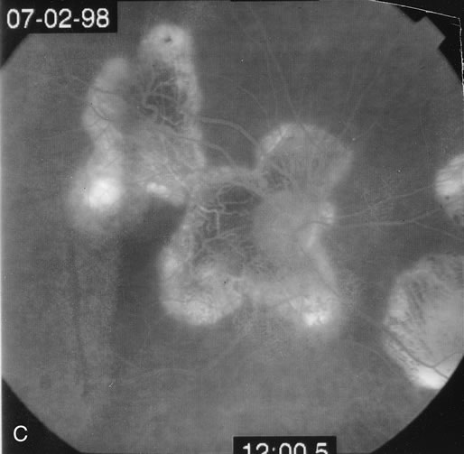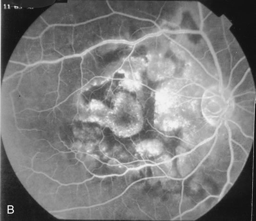 Fluorescein angiography may show hyperfluorescent spots that increase slightly in the later phases in active lesions. In inactive lesions, these spots become window defects. If there is a choroidal neovascular membrane it is usually seen at the edge of the scar and tends to have classic features. ICG angiography shows hypofluorescent lesions some of which cannot be seen by fundoscopy or by fluorescein angiography. In addition, there may be hypofluorescence surrounding the optic disc in cases of enlarged blind spots in conjunction with multifocal choroiditis.42 ASSOCIATIONS Tubulointersitial nephritis and uveitis are more common among young women. Uveitis usually occurs a few months after the development of the systemic findings that include proteinuria, fever, fatigue, weight loss, and abdominal pain. Although the uveitis is often an anterior uveitis, there has been a case of multifocal choroiditis associated with tublointerstitial nephritis.43 There have been a few cases of multifocal choroiditis associated with West Nile disease (William F. Mieler, personal communication). In addition, the Epstein-Barr virus has been associated with a few cases of multifocal choroiditis.44,45 Familial juvenile systemic granulomatosis is characterized by granulomatous polyarthritis, granulomtous uveitis, and a rash.46-48 It is an autosomal dominant disorder linked to chromosome 16. Many of these patients have been noted to have an anterior uveitis, which may be granulomatous or not and a posterior uveitis that presents as multifocal choroiditis and they also have a vitreitis. The fundus findings are similar to those seen in sarcoidosis or in multifocal choroiditis and panuveitis. TREATMENT OF MULTIFOCAL CHOROIDITIS Treatment is rarely required to prevent the development of choroiditic lesions. If it is necessary, corticosteroids have been used but it is still controversial whether they prevent the development of new lesions. More often treatment is required because of the development of choroidal neovascular membranes or cystoid macular edema. Approximately one third of the eyes tend to develop choroidal neovascularization at the edges of a choroidal lesion.40 If the membranes are extrafoveal, laser photocoagulation is the best treatment. For subfoveal choroidal neovascular membranes or juxtafoveal choroidal neovascular membranes that are within 50 μm from the center, the best method of treatment is still controversial. Photodynamic therapy can be considered as well as surgical excision. Sometimes the choroidal neovascular membranes may respond to periocular subtenon's corticosteroid injections or systemic corticosteroids. Consideration of adjunctive intraocular corticosteroid injections with photodynamic therapy has not been reported but may be a reasonable consideration in this disease. Cystoid macular edema may be a cause of marked visual loss in patients with multifocal choroiditis. Approximately 10% may lose vision worse than or equal to 20/200 because of cystoid macular edema.40 Periocular corticosteroid or systemic corticosteroids may be helpful. In addition, some cases respond to systemic methotrexate. Intraocular corticosteroids may also be considered. |