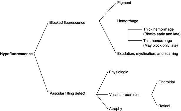 HYPOFLUORESCENCE Hypofluorescence may be caused by blocked fluorescence, which is synonymous with transmission decrease, or by a vascular filling defect. Blocked fluorescein corresponds to the size, shape, and location of the blocking material seen ophthalmoscopically. Any hypofluorescence that does not correspond to the ophthalmoscopic picture must then be considered a vascular filling defect. With ICG angiography, hypofluorescence needs to be analyzed by taking into consideration its evolution during the different phases of the angiogram. It is important to distinguish between hypofluorescence observed in both the early and late phases and when it is observed only in the later phases. The blockage depends on the nature of the blocking material and on the background choroidal fluorescence. Blocked Fluorescence Retinal. Any opacification in front of the retinal vessels that reduces media clarity causes blocked retinal vascular hypofluorescence on fluorescein angiogram (FA). Many inflammatory conditions produce hazy media, causing poor visualization of fundus detail. Fibrotic or gliotic membranes and inflammatory material on the retina or involving its inner layers obstruct the view of the retinal vasculature and cause blocked fluorescence. CHOROIDAL. Hypofluorescence can result from blocked choroidal vasculature due to fluid, exudate, hemorrhage, pigment, or other material accumulating in front of the choroidal vasculature deep to the retinal vasculature. Any opaque substance located beneath the retina but in front of the choroid blocks fluorescence of the choroidal vasculature; however, it does not block retinal vascular fluorescence. Fluorescence can be blocked by substances such as fluid in retinal pigment epithelial detachments and inflammatory material in acute multifocal posterior placoid pigment epitheliopathy (AMPPPE). In general, the blockage to ICG is less than that to fluorescein. For example, although blood at any level can lead to blockage throughout the FA, blockage may occur only in the later phases in ICG angiography. However, inflammatory diseases that primarily affect the choroid, such as birdshot chorioretinopathy and multifocal choroiditis, may result in profound and more dramatic blockage than that observed with FA. Vascular Filling Defect RETINAL. A vascular filling defect is the other cause of hypofluorescence in the retina if blocked fluorescence is not present. For a retinal vascular filling defect to be diagnosed, the location of the defect must be determined. It may arise from inflammatory obstruction of the artery, vein, or capillary or from a combination of these. Eales' disease, sarcoidosis, and other inflammatory diseases also cause peripheral capillary nonperfusion. CHOROIDAL. In ICG angiography, vascular filling defects have been subdivided into those that are physiologic, those resulting from a vascular occlusion, and those that are caused by tissue atrophy (see Fig. 1).4 Physiologic filling defects may be the result of choroidal watershed zones (early defects) and choroidal vascular silhouette against the background choroidal fluorescence (late defect). In contrast to FA, ICG studies are better at delineating choroidal vascular occlusion than are retinal vascular defects. Patients with AMPPPE may show persistent vascular filling defects after resolution of the condition. Choroidal vascular atrophy may develop in patients with a condition such as age-related macular degeneration, which results in vascular bed closure from scar formation. HYPERFLUORESCENCE Hyperfluorescence is any abnormally light area on the positive print of an angiogram. There are three types of hyperfluorescence in uveitis: transmitted fluorescence, abnormal vessels, and leakage. Transmitted Fluorescence Increased visibility of fluorescence from the choroidal vasculature caused by the absence of pigment in the pigment epithelium is called transmitted fluorescence (i.e., a pigment epithelial window defect) on FA. Various types of inflammation at the level of the pigment epithelium, choriocapillaris, or choroid produce pigment epithelial window defects such as AMPPPE, serpiginous choroiditis, and histoplasmosis. Each of these inflammatory conditions adversely affects the pigment epithelium, resulting in depigmentation and atrophy. Window defect is a very frequent finding in a fundus that has undergone choroidal inflammation. In ICG angiography, transmitted fluorescence may present as one of two forms depending on the integrity of the choriocapillaris. When the choriocapillaris is intact, transmission hyperfluorescence of the larger choroidal vessels is noted in the early phases of the angiogram. In the late phases of the study, the fluorescence pattern appears normal. In conditions associated with atrophy of the choriocapillaris, hyperfluorescence of the larger choroidal vessels is noted in the early phase of the angiogram. However, this area may become relatively hypofluorescent in the later phases because of decreased or absent perfusion of the choriocapillaris. Abnormal Vessels RETINAL AND DISC. There are many diseases that produce neovascularization. Retinal ischemia is theorized to be the primary pathogenic stimulus. Most of the disease processes resulting in neovascularization show some degree of ischemia by fluorescein angiography, with capillary nonperfusion an almost constant finding. The diseases that are known to result in neovascularization are phlebitis (Eales' disease), severe uveitis, pars planitis, sarcoidosis, and Behçet's disease. CHOROIDAL. Fluorescein angiography has proved to be of great value as an aid in the recognition and demonstration of normal and abnormal vascular patterns in the subretinal and choroidal tissues. The demonstration of subretinal neovascularization (SRNV) by fluorescein angiography (early lacyhyperfluorescence) represents one of the most significant advances in ophthalmic knowledge. Although ICG angiography can identify abnormal vessels in the