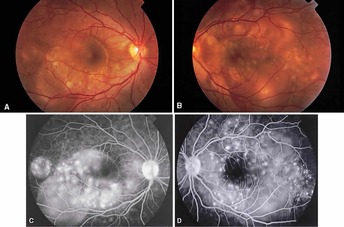 SYPHILIS Luetic chorioretinitis can present as a myriad of clinical findings, such as a salt-and-pepper fundus, cotton-wool spots, exudative retinal detachment, periarteritis, periphlebitis, disc edema, neovascularization, occlusive arteritis, multiple flat gray chorioretinal lesions, and macular edema. Ocular syphilis may mimic retinitis pigmentosa or acute retinal necrosis. Disciform scars are sequelae of macular choroidal inflammation. With cotton-wool spots and macular edema, capillary nonperfusion and diffuse leakage are seen, respectively, on fluorescein angiography. Patients with syphilis who have a retinitis pigmentosa-like fundus frequently show attenuated arterioles, delayed venular filling with late leakage of the peripapillary vessels, and mottled choroidal fluorescence.72 An edematous disc leaks dye.73 A fluorescein appearance similar to that of branch ret-inal vein obstruction can be seen.74 In rare cases, however, the FA in a patient with periarteritiscan be normal.75 Choroiditis can be seen as choroidal hyperfluorescence that resolves with treat-ment.72 SRNV presents with a typical appearance.76 Several cases of unilateral chorioretinitis presented as severe visual loss as the first manifestation of early secondary syphilis. Fluorescein angiography in these cases showed diffuse leakage under the neurosensory retina in the posterior pole associated with multifocal areas of staining along the retinal vessels (Fig. 22).77 A case of bilateral syphilitic posterior placoid chorioretinitis mimicking AMPPPE has been reported. ICG angiography showed hypofluorescent lesions during both early and late phases of the study, suggesting inflammation-associated perfusion abnormalities of the choriocapillaris.78 TUBERCULOSIS Tuberculosis has numerous ocular presentations, including anterior uveitis, scleritis, sclerokeratitis, phlyctenulosis, interstitial keratitis, choroidal granulomas (often with serous elevations; Fig. 23A),retinal exudate, macular star formation, retinal vas-culitis, vitreous cells, SRNV, and optic nerve granulomas. Eales' disease, a bilateral peripheral vasculitis with peripheral neovascularization and vitreous hemorrhage, frequently occurs in young men who have positive purified protein derivative test results (Fig. 24).