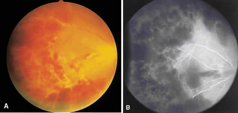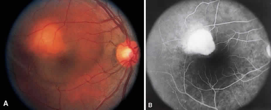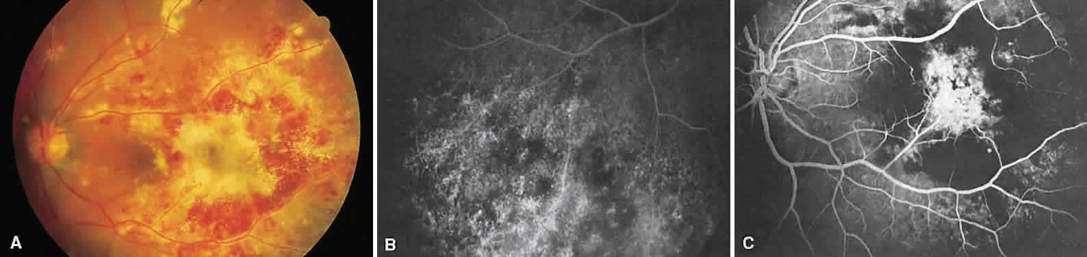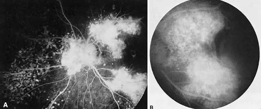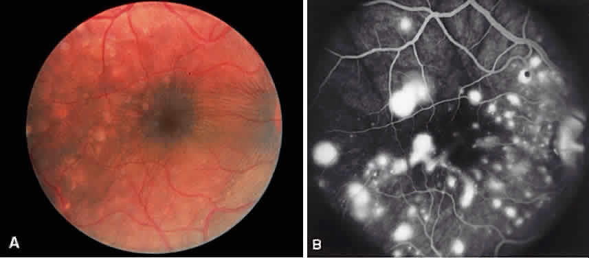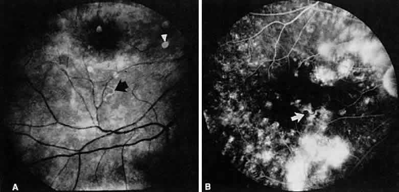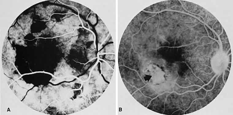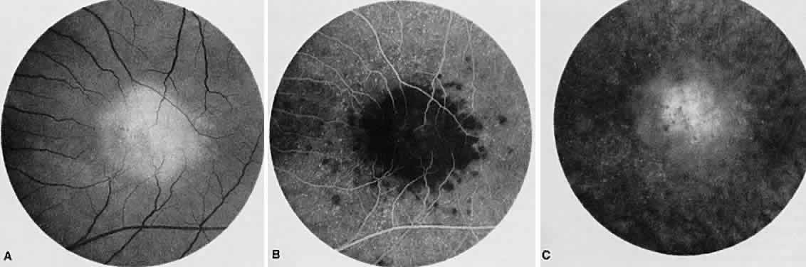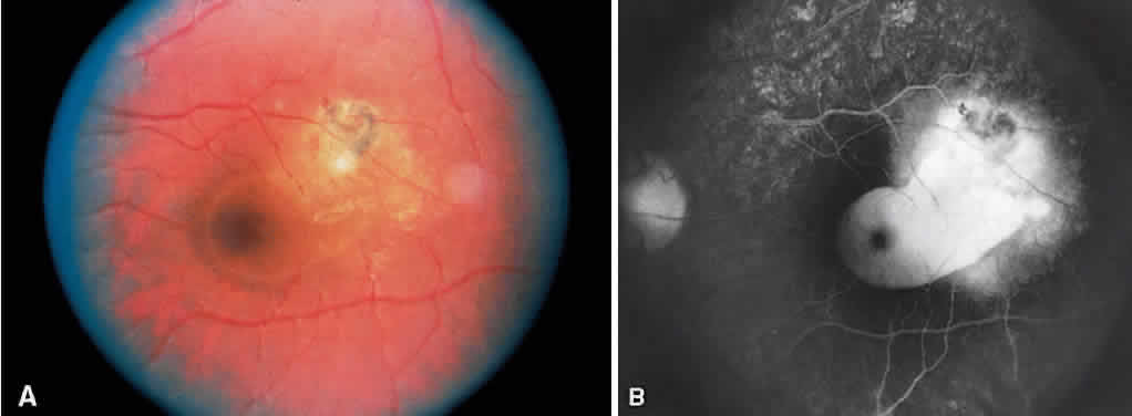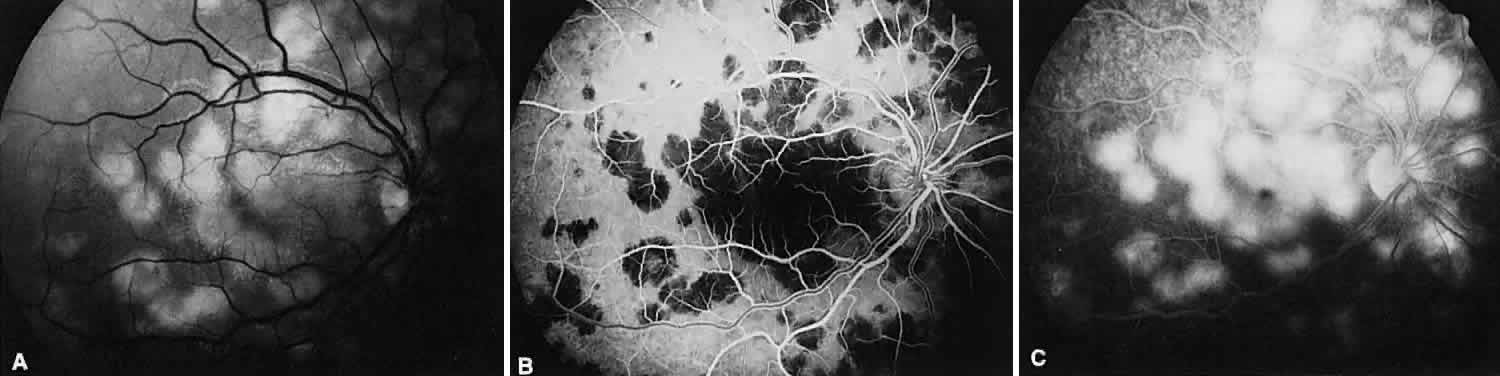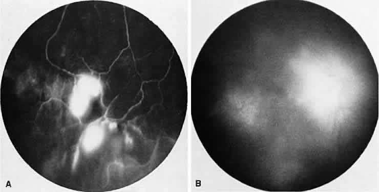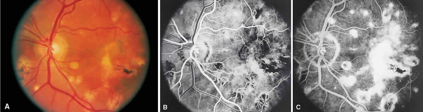 PRESUMED OCULAR HISTOPLASMOSIS SYNDROME Presumed ocular histoplasmosis syndrome consists of the following triad: peripapillary atrophy, “punched-out” chorioretinal lesions, and disciform macular scarring in young and middle-aged adults (Fig. 25A). If punched-out lesions (atrophic spots) occur in the macula, the probability of SRNV occurring within 3 years increases from 3% to 25%. A systemic histoplasmosis infection during childhood is believed to cause the syndrome. Fluorescein angiography is an important diagnostic test because SRNV is a major cause of vision loss (see Fig. 25B and C).82 The SRNV can be either peripapillary or macular. The choroidal neovascular membranes appear as a lacy network surrounded by a hypofluorescent ring in the early phase of angiography. A hallmark is the enlarging subretinalhyperfluorescence seen in the late venous phases. Punched-out lesions show early hypofluorescence followed by late scleral staining from the adjacent choriocapillaris,83 which can be differentiated from the progressively enlarging hyperfluorescence of SRNV. With ICG angiography, focal hyperfluorescent spots, which are more numerous than those seen on FA, are noted in the posterior pole during the intermediate or late phase of the study. These lesions are not detectable in most cases on funduscopic examination. Smaller hypofluorescent spots also are seen in some patients with this condition. They are similar to those observed in multifocal choroiditis. However, the larger hypofluorescent spots seen in multifocal choroiditis are not found in ocular histoplasmosis. This latter finding in ICG angiography allows the two conditions to be distinguished. If SRNV develops, localized areas of hyperfluorescence with late staining are seen. This observation helps to distinguish neovascularization from localized inflammation, with the latter showing persistent late hypofluorescence.84 CANDIDA ENDOPHTHALMITIS Candida endophthalmitis generally occurs in immunosuppressed patients and intravenous drug abusers. It also can occur in patients receiving hyperalimentation therapy and in patients after abdominal surgery. Candida endophthalmitis presents as white retinal abscesses with and without hemorrhage that extend into the vitreous and form vitreous snowballs (Fig. 26A). Roth's spots also can be seen. On fluorescein angiography, there are multiple early hypofluorescent deep retinal lesions that are not seen clinically. The white retinal lesions stain progressively in a centripetal fashion in the later phases (see Fig. 26B).85 |