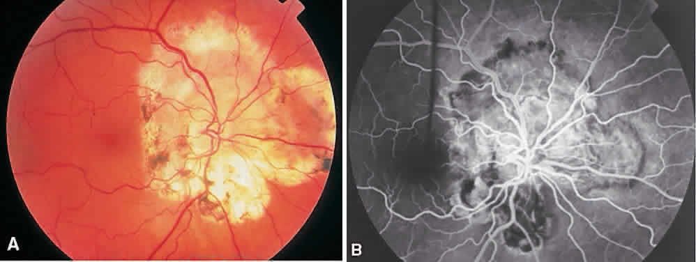 branch retinal artery occlusion also can be seen (Fig. 28A). A variant form of toxoplasmosis shows multiple gray-white deep retinal