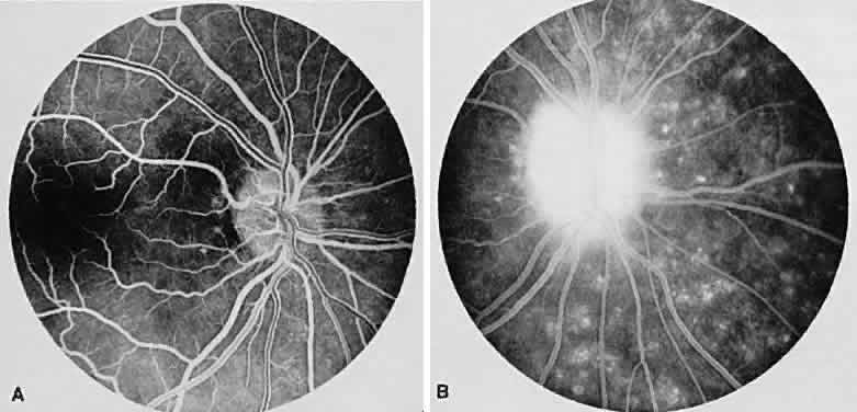 ACUTE RETINAL NECROSIS Acute retinal necrosis is an often bilateral peripheral retinitis that generally occurs in young, healthy adults. Herpes simplex, cytomegalovirus retinitis, and herpes zoster virus have been implicated as the etiologic agents in various patients. Acute retinal necrosis has a similar clinical appearance to proven cytomegalovirus retinitis. It presents as peripheral white necrotic retinal lesions, often with arteriolar occlusions and sheathing (Fig. 18A). Disc edema and pallor can be seen. Retinal detachments are frequent sequelae of the infection. Fluorescein angiography (see Fig. 18B) shows multiple retinal vascular occlusions, particularly arteriolar. In the late phases, the retinal vessels stain, often proximal to the occlusion. Nonoccluded vessels also may show staining.63,64 Late staining of the disc can be seen during the acute phase.64 The differential diagnosis includes herpes zoster retinitis, toxoplasmosis, and Behçet's disease. CYTOMEGALOVIRUS RETINITIS Cytomegalovirus retinitis often is found in immunosuppressed patients and in patients with acquired immunodeficiency syndrome. Clinically, it presents a sharply demarcated necrotizing hemorrhagic retinitis with a vasculitis that often is occlusive. The necrotizing retinitis usually is located in the midperiphery and clinically manifests as whitish opacifications in the deep retina and in the retinal pigment epithelium. Retinal hemorrhages are seen in the necrotic area and surrounding the leading edge (Fig. 19A). Retinal vascular sheathing, usually periphlebitis, may be bilateral or unilateral (Fig. 20).65 Retinal detachments (both exudative and rhegmatogenous) and vitreous cells can occur. On fluorescein angiography, findings that parallel the clinical appearance can be seen. Fusiform aneurysmal dilations of arteries, arteriole venules, and capillaries as well as capillary microaneurysms can be seen.66 The area of retinitis and necrosis blocks the choroidal fluorescence (see Fig. 19B); however, in the late venous phase, hyperfluorescence of the center lesion can be seen. Branch retinal artery occlusions may be seen.67 In addition, late dye leakage from arteries67 and optic disc occurs. ACQUIRED IMMUNODEFICIENCY SYNDROME Acquired immunodeficiency syndrome is caused by the human immunodeficiency virus. In addition to cytomegalovirus retinitis, the ocular complications of acquired immunodeficiency syndrome include Kaposi's sarcoma of the lids or conjunctive, Roth's spots, retinal hemorrhage, microaneurysms, telangiectasia, disc edema, cotton-wool spots, and cranial nerve palsies. On fluorescein angiography, microaneurysms, telangiectases, and small areas of capillary nonperfusion corresponding to the cotton-wool spots have been seen.68 HERPES ZOSTER Herpes zoster can cause an iridocyclitis with sector iris atrophy and retinal arteritis, retinal necrosis, and central retinal vein occlusion.69 Sector iris atrophy can be seen on iris fluorescein angiography.70 With arteritis, arteriolar narrowing and slow dye transit with fluorescein leakage are evident. SUBACUTE SCLEROSING PANENCEPHALITIS Subacute sclerosing panencephalitis is a progressive neurologic disorder that occurs in children and young adults. Measles virus is believed to be the infectious agent. Personality and behavioral changes occur and are followed by neurologic symptoms of seizures, dementia, coma, and death. Half the patients have visual involvement, which often antedates the neurologic symptoms. Clinically, a focal posterior pole retinitis and flat focal white retinal lesions are seen (Fig. 21). With fluorescein angiography during the acute stage, the lesions mask the choroidal fluorescence. There is late venous leakage, vein staining, and arteriole and venule occlusions.71 |