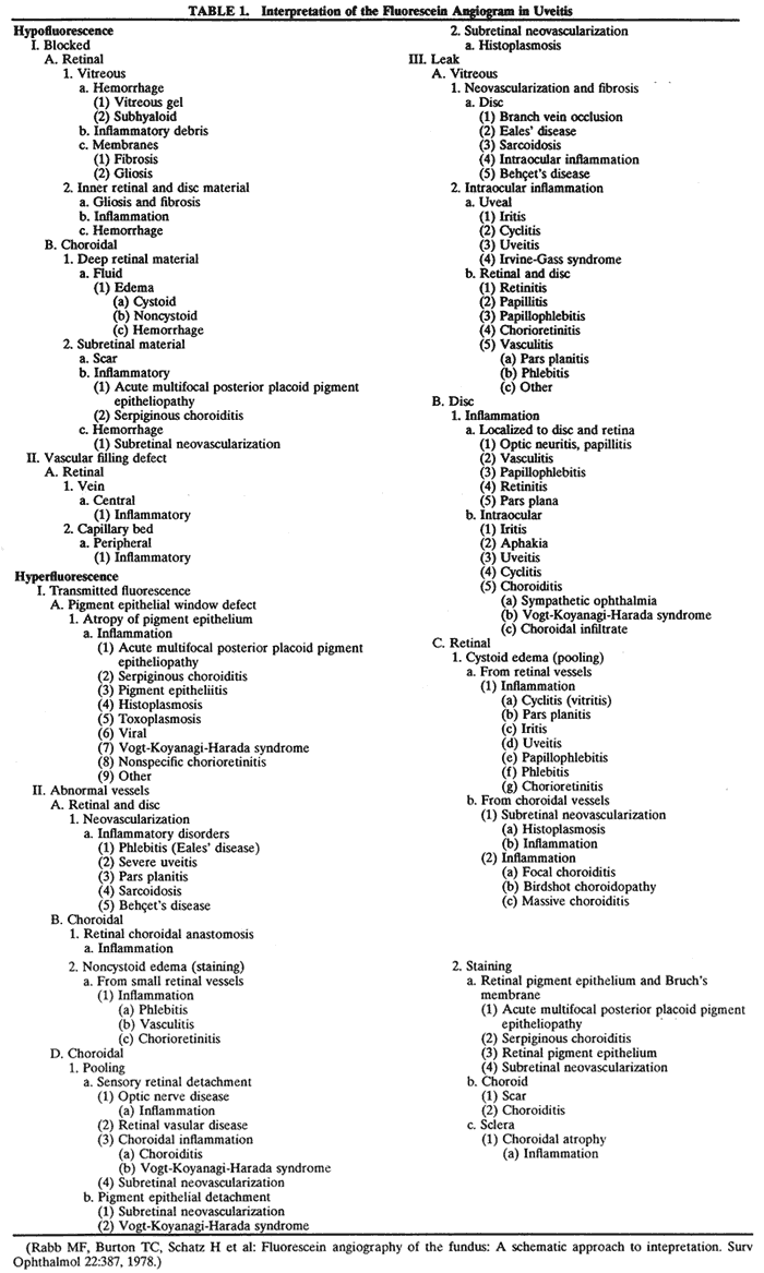angiography in imaging the choroidal circulation. In this chapter, we describe the characteristic angiographic findings in many common uveitic syndromes using abnormal hypofluorescence or hyperfluorescence patterns with both fluorescein (Table 1)2,3 and ICG (Fig. 1).4 Many of these clinical entities and their treatments are described in more detail in other chapters in these volumes.