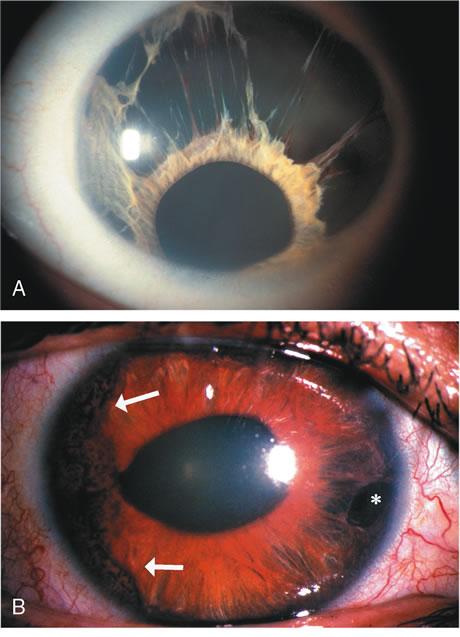 Segmental iris atrophy might also occur from anterior segment inflammation45 This has been most commonly described with herpes zoster virus41,42 (Fig. 6A) and also been seen after herpes simplex,43 bee stings,44 and cytomegalovirus infections.45 The atrophy at times is limited to a focal segment and holes may result. Focal iris atrophy may also be seen in granulomatous disease such as tuberculosis and syphilis. A wide variety of atrophic iris changes may be seen in leprosy.46 The findings that best distinguish these postinflammatory secondary atrophies from mere senile atrophy are the presence of anterior and posterior synechiae.
