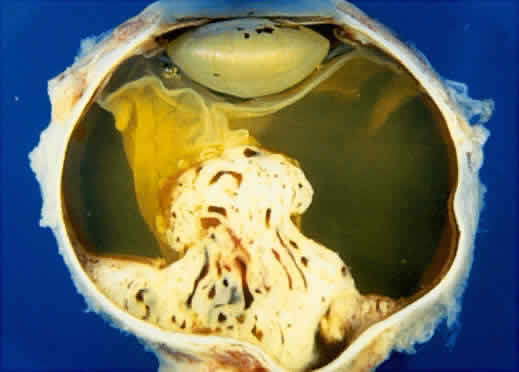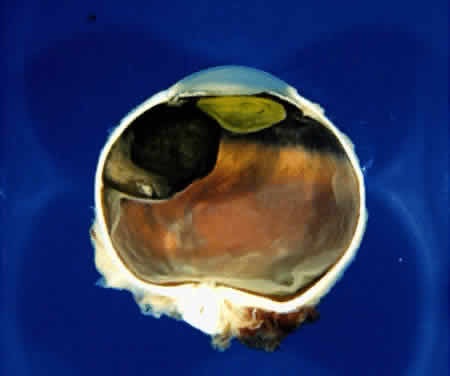 The growth patterns of choroidal melanoma can be best appreciated by examining gross sections of eyes enucleated for this disease. The tumors can either be dome shaped and deeply pigmented (Fig. 13) or amelanotic. The mushroom-shaped tumor typically produces a secondary nonrhegmatogenous retinal detachment (Fig. 14).