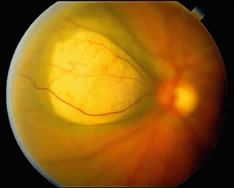 of the Sturge-Weber syndrome.26 Unlike uveal melanoma, uveal hemangioma occurs only in the choroid. Circumscribed choroidal hemangioma usually appears as a sessile or minimally elevated, redorange mass similar in color to the surrounding normal fundus. Smaller lesions (Fig. 18) are rather homogeneous and do not usually produce a secondary retinal detachment. Larger lesions can produce overlying proliferation or metaplasia of the retinal pigment epithelium and secondary retinal detachment. The diagnosis of circumscribed choroidal hemangioma is best made by recognition of the typical red-orange color of the choroidal mass. Such coloration is not usually seen with amelanotic choroidal melanoma, choroidal metastasis, and other choroidal masses. Fluorescein angiography and ultrasonography can be used to help confirm the diagnosis. Fluorescein angiography usually shows linear hyperfluorescence of the blood vessels in the tumor in the prearterial phase and rather intense late staining of the mass. A-scan ultrasonography shows high internal reflectivity, and B-scan shows acoustic solidity without the choroidal excavation that characterizes melanoma.26 Since circumscribed choroidal hemangioma is a benign lesion that usually remains stationary or demonstrates only minimal enlargement, asymptomatic tumors generally require no treatment. If the tumor produces a secondary retinal detachment that causes visual impairment, then laser photocoagulation to control the detachment is often warranted.26 In cases where the retinal detachment cannot be controlled with laser therapy and there is a threat of neovascular glaucoma, plaque brachytherapy can be successfully used. After approximately 2000 cGy, the tumor generally becomes smaller and the retinal detachment resolves. Diffuse choroidal hemangioma occurs ipsilateral to a facial nevus flammeus, sometimes in association with the Sturge-Weber syndrome.27 Clinically, it appears as a broad red-range thickening of the posterior choroid. The tumor appears more red than the background fundus, a finding sometimes called the “tomato ketchup” fundus. With time, the choroidal hemangioma produces cystic retinal degeneration and eventually an extensive secondary retinal detachment. The presence of an ipsilateral facial nevus flammeus in a patient with a nonrhegmatogenous retinal detachment should suggest the diagnosis.27 Ultrasonography and fluorescein angiography can provide diagnostic assistance. Cranial computed tomography or magnetic resonance imaging to detect the meningeal calcification of the Sturge-Weber syndrome may also provide diagnostic help. Diffuse choroidal hemangioma of the SturgeWeber syndrome can be difficult to manage. In its earliest stages, a refraction and treatment for hyperopic amblyopia is the best approach. Later, the secondary retinal detachment is best managed by laser photocoagulation or retinal detachment surgery, depending on the extent of the disease. External beam irradiation may bring about reduction of the retinal detachment. |