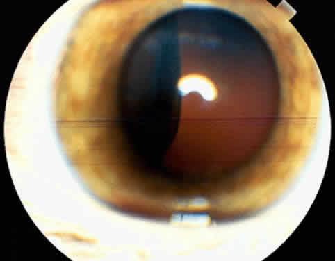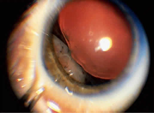 can be divided into congenital and acquired types.32–35 The most important congenital tumor of the nonpigmented ciliary epithelium is medulloepithelioma. Intraocular medulloepithelioma most often occurs unilaterally in young children in the first decade of life. It is an embryonic neoplasm that arises from the primitive medullary epithelium that is destined to form the nonpigmented ciliary epithelium in the adult. Cytological, it can be benign or malignant, but it rarely exhibits distant metastasis. Both the benign and malignant variants can occur as either a nonteratoid or a teratoid type. The nonteratoid type consists of a proliferation of fairly well-differentiated cells of the nonpigmented ciliary epithelium. The teratoid type contains heterologous elements, such as cartilage and skeletal muscle. In the early stages, medulloepithelioma appears as a gray-white tumor of the ciliary body (Fig. 23). As it slowly enlarges, it can cause a subluxation of the lens, secondary cataract, secondary glaucoma, retinal detachment and a white pupillary reflex (leukocoria) A characteristic feature is the development of clear cysts that are visible near the surface of the lesion. These cysts frequently break away from the main lesion and float freely in the vitreous or aqueous cavity. The main lesion continues to slowly enlarge and can eventually fill the entire globe and rarely extend through the sclera into the orbit. The management of intraocular medulloepithelioma is removal of the tumor by partial lamellar sclerouvectomy when it is small and circumscribed. However, there is tendency for recurrence, and enucleation may ultimately be necessary in many cases.34 The systemic prognosis is generally quite favorable. Acquired neoplasms can develop from the fully formed nonpigmented ciliary epithelium. Unlike the embryonic medulloepithelioma of childhood, acquired tumors of the nonpigmented ciliary epithelium do not contain teratoid elements. From a cytologic standpoint, they can be benign (adenoma) or malignant (adenocarcinoma). Even the malignant variant has little or no tendency to exhibit metastatic disease. Like the embryonic variant, these acquired tumors begin as an amelanotic mass of the pars plicata. They can have a smooth or irregular surface, and they occasionally contain clear cysts. They can also produce a secondary cataract (Fig. 24).