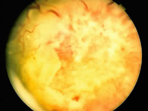 metastasis is not as common as primary uveal melanoma. Most metastatic cancer to the intraocular structures resides in the uveal tract. Metastasis to the retina is exceedingly rare. Most are carcinomas, and metastatic melanoma and sarcoma to the uvea are much less common. Metastatic tumors to the uvea usually reach the choroid; metastasis to the iris and ciliary body are less common. All metastasis to the uvea comes through hematogenous routes, because there are no intraocular lymphatic channels. The primary malignancies that account for most uveal metastasis are breast cancer in women and lung cancer in men, although a number of other tumors can also spawn uveal metastasis. The ocular manifestations vary depending on whether the metastasis is in the iris, ciliary body, or choroid. Iris metastasis can have several clinical variations.23–25 In general, it appears as a solitary, fleshy mass or as a white, fluffy, loosely cohesive mass (Fig. 15). These friable tumors can seed tumor cells into the anterior chamber, producing a tumor-induced pseudohypopyon. In other cases, an iris metastasis can bleed, causing a spontaneous hyphema. Ciliary body metastasis is less commonly recognized. It can attain a larger size than iris melanoma before it is recognized clinically. It often masquerades as a granulomatous iridocyclitis or endophthalmitis. A choroidal metastasis is usually different from a metastasis to the iris or ciliary body. It is confined by Bruch's membrane and does not generally exhibit the tumor seeding that often characterizes anterior uveal metastasis. It appears as a creamyellow-colored sessile or minimally elevated mass (Fig. 16). Unlike an amelanotic choroidal melanoma, it is often multifocal (Fig. 17) and bilateral. Choroidal metastasis located near the optic disc has a propensity to infiltrate the nerve and produce disc edema and superficial hemorrhage. Uveal metastasis is best diagnosed by clinical recognition of the typical iris or fundus findings described earlier. In cases where the choroidal lesion is atypical and metastasis is a diagnostic consideration, fluorescein angiography and ultrasonography can provide diagnostic help. In cases where the diagnosis of an iris, ciliary body, or choroidal lesion remains uncertain despite noninvasive diagnostic studies, fine-needle aspiration biopsy can be used to make a definitive diagnosis.4 The management of uveal metastasis usually involves chemotherapy or irradiation. If the patient is receiving chemotherapy for systemic disease, then the choroidal metastasis can be followed without direct ocular treatment. If systemic chemotherapy does not control the uveal metastasis, then ocular irradiation (approximately 3500 cGy over a 4- to 5-week period) is advisable. About half of patients with choroidal metastasis require ocular irradiation, and the other half can be successfully controlled with chemotherapy or hormonal therapy.23,24 |