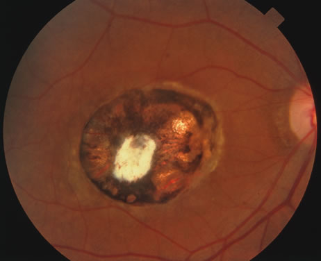 Scrapings of mucocutaneous lesions will demonstrate pseudohyphae on wet smear. Culture of vitrectomy specimens may yield organism in smear and culture. Diagnosis should be confirmed by culture on Sabouraud's medium or blood agar as well. Blood cultures are often negative with the exception of cases involving endocarditis. Cutaneous candidiasis is treated with topical clotrimazole, miconazole or nystatin powder. Intravenous amphotericin B is the drug of choice in disseminated candidiasis. Flucytosine is synergistic with amphotericin and given at a dose of 150 mg/kg per day allows for a decreased dosing rate of amphotericin. Ocular penetration of intravenous amphotericin is poor, therefore, pars plana vitrectomy and intravitreal injection of amphotericin should be considered, in addition to intravenous therapy. Vitrectomy may be useful for diagnosis as well as therapy. Amphotericin B has severe systemic toxicity as well as retinal toxicity often requiring discontinuation of therapy. It has been suggested that oral fluconazole may be used as initial treatment or in cases refractory to intraocular amphotericin.116 ASPERGILLOSIS Aspergillus is a common mold found throughout the world. It is most often associated with soil and/or decaying vegetation. Spores become aerosolized and enter human alveoli through inhalation of contaminated air. In a normal immunocompetent host the spores rarely cause disease. However, immunocompromised individuals such as those with leukemia, HIV, endocarditis or patients with heart, lung and liver transplants are at risk for devastating invasive disease caused by aspergillus. The most common species causing disease in humans is Aspergillus fumigatus, followed by A. flavus, A. niger, and A. nidulans.117 Diseases from infection with invasive Aspergillus include pneumonitis, sinusitis and rarely endophthalmitis. Endophthalmitis most commonly occurs through spread from adjacent sinus infection or via blood borne spread in intravenous drug users. Fungal endophthalmitis typically presents with rapid onset of pain, visual loss and a yellow macular infiltrate in the subretinal space which may progress to full-thickness retinal necrosis (Fig. 29). Aspergillosis is the second most common cause of endogenous endophthalmitis after Candidiasis.118,119 Other ocular manifestations of aspergillus infection include fungal keratitis, orbital abscess, orbital apex syndrome, and optic neuropathy.120 Aspergillus species have a tendency to invade blood vessels resulting in thrombosis, infarction, and necrosis of involved tissue.
