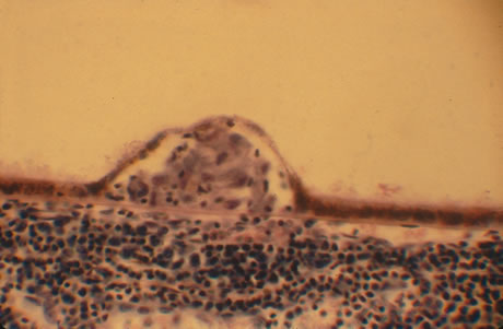 Histopathology of sympathetic ophthalmia shows granulomatous uveal inflammation with epithelioid cells, lymphocytes, multinucleated giant cells, eosinophils, and a few plasma cells. Generally there is sparing of the choriocapillaris. Epitheliod cells contain phagocytosed uveal pigment (Fig. 60). The granulomatous inflammation may extend into the scleral canal. Macular edema, with fluid accumulating in the outer plexiform layer as well as serous detachment of the sensory retina in the posterior pole can be observed (Fig. 61). Historically, 25% of cases of sympathetic ophthalmia have been associated with phacoanaphylactic endophthalmitis. In the injured eye one can see uveal prolapse, with a track of the wound to the limbus. There is extensive inflammation and Figure 62 is an artist's drawing from Fuchs' Atlas of Pathology showing panuveal inflammation; the pink areas represent epitheliod cells, whereas the dark zones are lymphocytic infiltration that has given rise to a marbleized appearance. Eosinophils may be readily seen among the lympocytes.