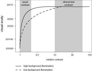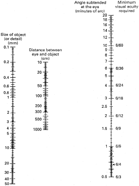 Visual discomfort from glare and other sources accumulates during the work day, and task rotation may be a reasonable preventive measure if other adjustments are not successful. CONTRAST. The eye detects objects by responding to the differing levels of illumination at the target edges, or contrast29: Contrast = <fr background illumination - target illumination/background illumination> To determine the optimal illumination levels for a task, the contrast and size should be measured. It is difficult to measure the contrast of a practical task. These vision standards, either mandatory (e.g., DOT) or voluntary (Purdue Standards), apply to tasks of normal contrast and reflectance. If, however, the contrast or reflectances are low and mistakes are made because of wrong perception, these are likely to be dangerous or costly. The recommended illumination should be increased to compensate for the decrease in contrast of the object considered. Concerns regarding the visibility of tasks have influenced the American codes for lighting.46 The initial experiments carried out investigated the threshold detection of static disc targets, and later experiments involved the detection of dynamic targets. The dynamically presented targets were believed to create conditions more similar to a practical task. More recent studies have investigated the effects of lighting on the visual performance of a 20- to 30-year-old age group.47 Older individuals require more light than younger ones to perform a similar task.29 COLOR. Deficiencies can be either congenital or acquired. The ability to discriminate colors is particularly influenced by age and illumination. It has been shown that with age there are more errors in hue discrimination in the blue-green and red regions.48 This study showed that the number of sorting errors in the FM 100 hue test could be reduced by increasing illumination.48,49 TIME AVAILABLE TO VIEW TASK AND MOVEMENT OF THE TASK. The time available to see the task is important; too short a time exposure will reduce the visibility, especially if the task is moving.29 The time available to view the letters and so forth will influence the visual acuity measured. It has been estimated that a person can transmit up to 10 bits/second (a bit is a unit of information processed in a second) of visually displayed information. This is a very small amount of information, when it is estimated that the human sensory system has a capacity to transmit millions of bits per second. Therefore, it is not only the input of the visual system that limits the visual performance but the processing, decision making, and motor output. Letters can usually be recognized in under a second, and, obviously, the better the illumination and the larger the letter, the faster the recognition time. ATMOSPHERIC CONDITION. Atmospheric conditions in such industries as foundries and mining, in which there may be dust, smoke, or steam, will reduce visibility because of the absorption of light.29 Interactions of Luminance, Contrast, and Glare Three major factors that influence visual acuity are luminance, contrast, and glare. The influence of luminance on visual acuity may be plotted (Fig. 3). The capacity of the visual system to resolve details increases with increasing luminance, although there is a level beyond which visual acuity does not increase; in fact, it may diminish because of disability glare. Contrast has a maximal effect on visual acuity at low levels of illumination but has a minimal effect at high levels. Spalton and colleagues,50 in their slide atlas of ophthalmology, state that the graph of visual acuity plotted against contrast shows the rapid improvement in acuity as contrast increases and the difference that background illumination makes to the acuity under the same conditions of contrast (Fig. 4). In clinical acuity tests black letters are displayed on a white background giving a contrast value of approximately 80%. In the normal eye under photopic conditions the threshold contrast is about 1%. The following example relates the association of distance and decreased contrast. The eye with a visual acuity of 20/40 visualizes a 1.0 mm-target at 14 in. (35 cm). At 28 in. by doubling the distance without change in size, the eye will require a visual acuity of 20/20 with high contrast. Using Figure 4, working at moderate contrasts would require a visual acuity of 20/05, a visual acuity not readily available in most human beings. In essence, doubling the distance doubles the visual requirement, and decreasing the contrast also doubles the visual requirement. Visual Factors for Specific Task There are occasions when on-site analysis is not possible. A logical method for determining the visual factors required for a particular task was devised by Grundy.51 From the knowledge of the distance and size of the critical detail of the task, the visual acuity necessary to discriminate the smallest detail can be determined. This can be calculated easily from a simple graphical method by using a nomogram, shown in Figure 5. For example, a task has a critical detail of 0.6 mm and is viewed at 70 cm. When a straight line is drawn through these values it will intercept the right-hand scale to indicate that the corresponding visual angle is 3.0 minutes of arc and the minimum visual acuity required is 6/18. It is important to remember that the values given are a measure of the resolving power of the eye, and higher standards are required for the task to be carried out for prolonged periods. It has been suggested that the visual acuity necessary for a demanding task should be approximately twice the minimum value.52 Therefore, in the previous case, a visual acuity of 6/9 is advised. The employee can often move closer to the task, increasing the angular subtense at the eye, but this depends on the amount of accommodation and convergence available. The older presbyopic employee, who has a reduced amount of accommodation, may need an intermediat