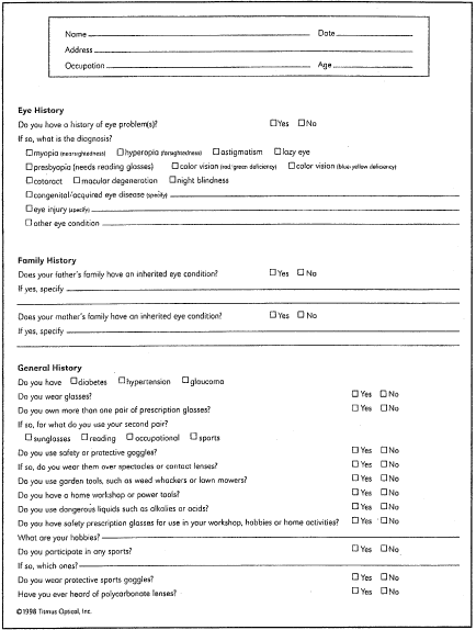 There was no procedural terminology code at that time. VISUAL SCREENING TESTS Battery Tests Typical Snellen charts represent only one measurement of the ability of the eyes to discriminate black and white detail at some standard distance (central visual acuity). Often, the distance at which the work must be performed is not considered when performing and evaluating these tests. The significance of any single test depends on the job requirements. Specific individual correlation between the visual demands of the job and the visual qualifications of the applicant should be applied. A visual history questionnaire specific for visual screening is useful (Fig. 7).