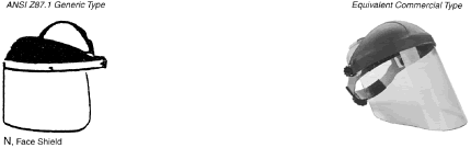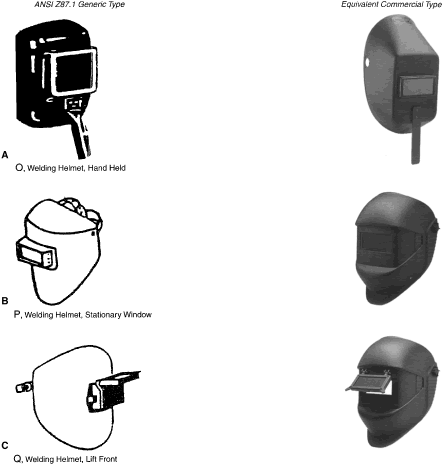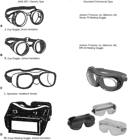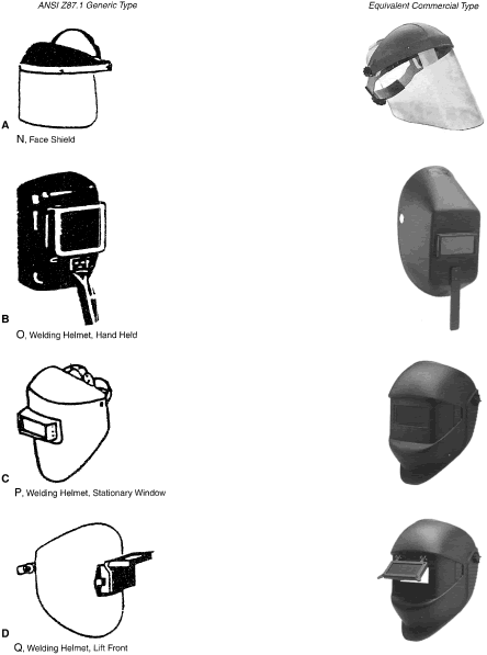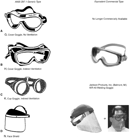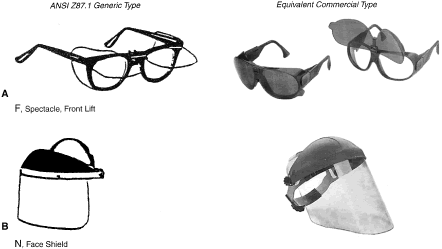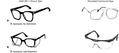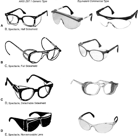 Identification of Personal Eye and Face Protection Equipment Appropriate protective equipment for the eye and face is required by OSHA (29CFR 1910.133).81 Eye and face protection is required where there is reasonable probability of preventing injury with such equipment. Other standards (ANSI Z136.1)82 and Z136.383 reflect on the prevention of laser burns, using similar engineering controls or personal protective goggles. All employees should acquire PPE appropriate for their activities or processes. Employees shall have types of protection suitable for the work to be performed and conveniently available. Employees should be required to use such equipment. No unprotected personnel should be subjected to hazardous environment conditions. These stipulations apply to supervisors, management personnel, and visitors while they are in hazardous areas. A summary of a questionnaire administered to patients who presented to the Massachusetts Eye and Ear Infirmary emergency services with ocular injuries in 1985 was reported by Schein and coworkers.14 All injuries were included except those resulting from contact lens use. Only 66% of those injured at work reported that protective eyewear was provided at the job site. Of those suffering severe injury, only one third reported that protective eyewear was available. Among those injured at work, 10% stated they were wearing protective eyewear at the time of injury, and none of these injuries was severe. Ruptured globes were the most common severe injury occurring at work. In approximately one third of the cases, a history of previous eye injury was obtained. Schein illustrated the type of eyewear worn at the time of injury for the study population: 70% were wearing no glasses, 10% wore safety glasses (of which 2% had side shields), 6% wore regular glasses, and 3% wore contact lenses. One third of the subjects whose regular glasses were broken at the time of trauma suffered severe injury. A 1980 Bureau of Labor Statistics Study84 noted about 60 % of workers who suffered eye injuries were not wearing eye protective equipment. When asked why they were not wearing face protection at the time of the accident, workers indicated that face protection was not normally used in their type of work, or it was not required for the type of work performed at the time of the accident. The United States Eye Injury Registry's 1996 report on 10,964 cases for the period 1988 to 2001 revealed that 62.5% of injured patients wore no protection and 2.7% wore regular streetwear spectacles, 1.5% safety eye and face protection, and 0.3% sun spectacles. The U.S. Food and Drug Administration regulation requires that all streetwear eyeglasses and sunglasses sold to the general public be shatterproof resistant.85 TYPES OF HAZARDS VERSUS PPE. Although PPE is part of the job in some industries such as face shields for welding it is considered a last-resort, temporary type of protection for most. The elimination of hazards in the environment, rather than PPE, is optimum.30 No single combination of protective equipment and clothing is capable of protecting against all hazards. PPE should be used in conjunction with other protective methods. The use of PPE can also produce significant worker hazards, such as heat stress; physical and psychologic stress; and impairments in vision, mobility, and communication. In general, the greater the levels of PPE protection, the greater are the associated risks. Equipment and clothing should be selected that provide an adequate level of protection. Overprotection or underprotection can be hazardous and should be avoided. Using PPE improperly or in a manner unsuited to its design and purpose is worse than using no protection. Without any protection, the worker knows that he is vulnerable and will perhaps take precautions. With inadequate protection, the worker may rashly blunder into severe difficulty because of a false sense of security. OSHA 29CFR 1910.13381 mandates the ANSI Z87.1 Eye and Face Protection41 regulations in which a table in ANSI Z87.1A correlates the basic types of eye hazards with the specific general type of spectacle and/or face shield required for the hazard. This table provides excellent guidance on the selection of types of eye/face safety equipment required. Although not mandated by OSHA, these requirements should be implemented when eye hazards exist in hobbies, at home, in school, in sports, or workplace where there is a reasonable probability of preventing injury when such equipment is used.21 The ANSI Z87.141 tables on protective devices are only representative of eye and face protective devices commonly found at the time of the writing of the standard. Protective devices do not need to take the exact forms shown, but must meet the requirements of the standard. In Figures 9, 10, 11, 12, 13, 14, 15, 16, 17, 18, 19, and 20, the generic types from ANSI Z87.141 are shown under the specific classes of hazards. The generic protective devices are compared with current nonprescription safety equivalent devices. Blais27 submitted a new organization of existing ANSI Z87.1 tables information that enables the user to identify the specific type of lens mandated by 29CFR 1910.133.81