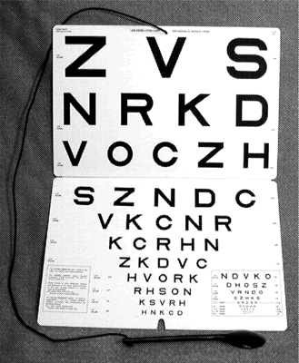In 1973 Hofstetter proposed the use of a 4-meter test distance34 for use in smaller rooms. For visual acuity measurement, this distance is as valid as any other distance, provided that it is properly entered into the Snellen formula. Sloan liked the 4-meter distance because it made for easy conversion to a 40-cm reading distance. The ETDRS charts adopted it because charts with the Bailey-Lovie layout would have to be substantially wider if designed for 5 or 6 meters. At 4 meters, however, the accommodative demand becomes 0.25 diopter and can no longer be ignored. Another option for small rooms is the use of mirrors. For young children, a test distance of 10 feet or 3 meters is often recommended, because it is easier to hold their attention at the shorter distance. CHOICE OF TEST DISTANCE FOR LOW VISION. A much smaller group of patients has visual acuity in the low-vision range (less than 20/60, ICD-9-CM; see Table 3). For this group, the magnification need for visual rehabilitation becomes an important objective. Kestenbaum35 pointed out that the magnification need can be found by taking the reciprocal of the visual acuity (e.g., 20/100 requires 100/20 = 5× , 20/200 requires 200/20 = 10× ). Bringing the chart from 20 feet (6 meters) to 10 feet (3 meters) can double the measurement range, but bringing the chart to 1 meter extends it by a factor 6× . Measuring at 1 meter has the additional advantage that the Snellen fraction is as simple as possible (1/ …) and can be converted easily to an equivalent for any other distance by multiplying numerator and denominator by the same number (e.g., 1/20 =20/400 = 5/100 = 6/120 = 0.05). The 1-meter column in Table 3 shows that a 1-meter chart with letters up to 50 M can cover the entire low-vision range down to 1/50 (20/1000, 0.02). Taking the same chart to 10 feet would extend the measurement range only to 20/300 (0.06). At short distances, such as at 1 meter, it becomes critically important to maintain the viewing distance accurately. A movement of only 10 cm (4 inches) would introduce a 10% error. This can be prevented with a 1-meter cord attached to the chart (Fig. 9). Such charts can be homemade or purchased commercially.36