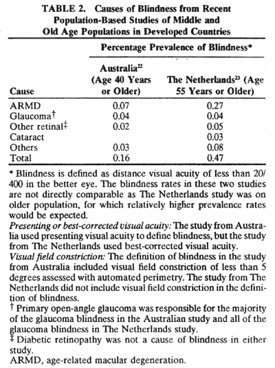 PREVALENCE Increase in the prevalence of blindness with increasing age has been reported in population-basedstudies from Africa,13–16 Asia,17–20 Australia,8,21,22 Europe,23 North America,7,24 and for the global data considered together.25 The age-specific rates of blindness are considerably higher in developing countries13–20 than in the developed countries.7,8,21–24 For example, blindness defined as presenting distance visual acuity less than 20/200 or visual field less than 20 degrees in the better eye was present in 0.43%, 4.56%, and 15% of those younger than 40 years, 40 to 64 years, and 65 years of age or older, respectively, in the population of the Indian state of Andhra Pradesh.20 These rates are 13 to 30 times higher than the 0.15% and 1.15% prevalence of blindness, defined as presenting distance visual acuity less than 20/200 or visual field less than 10 degrees in the better eye, reported from Victoria, Australia, in the 40 to 64 years and 65 years or older age groups, respectively22 (Fig. 1).