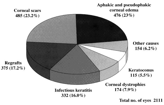 problems, and harmful eye practices lead to corneal blindness. In a series of 2111 eyes that underwent penetrating keratoplasty at L.V. Prasad Eye Institute in Hyderabad, India, corneal opacification was due to corneal scars (23.2%), aphakic and pseudophakic corneal edema (23.0%), regrafts (17.2%), active infectious keratitis (16.0%), corneal dystrophies (7.9%), keratoconus (5.5%), and various other causes (6.2%)2 (Fig. 1).