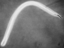 The blackfly larvae require well-oxygenated water to mature, and eggs are laid in rapids in fast flowing rivers and streams. Because of seasonal variation in volume and rate of flow, a particular stretch of river may be either a permanent breeding site or a temporary breeding site only at certain times of the year. Blackflies usually do not travel more than 1 or 2 km from their breeding sites, although at times they may be carried hundreds of kilometers by monsoonal winds. Female black flies require a blood meal to initiate ovulation, and it is during this meal that they may transmit or receive the onchocercal infection. THE PARASITE O. volvulus is one of a group of filarial nematodes. Other members include Wuchereria bancrofti and Brugia malayi, which produce lymphatic filariasis and elephantiasis and Loa loa, which causes loiasis. The adult worms live encysted in fibrous nodules, which may be single or conglomerate. Each nodule contains between two to three female worms lying in a twisted, tangled mass (hence the term volvulus). The adult female O. volvulus organism is a white threadlike worm, 30 to 70 cm long and only 0.3 mm across (Fig. 3). Adult males have a similar appearance but are thinner and much shorter (about 2.5 to 5 cm long). Adult female worms have a life span of 8 to 10 years but may live up to 15 years. During their lifetime, each releases millions of first-stage larvae, also known as microfilariae. A microfilaria is 320 to 360 μm long and 5 to 10 μm in diameter (Fig. 4) and lives for 6 to 30 months.1,2 In hyperendemic areas, the total microfilaria load in the body of affected individuals may be as high as 150 million.4