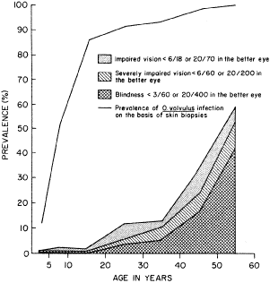 CYCLE OF INFECTION Microfilariae enter a female blackfly when she bites an infected person. A small percentage of these pass to the fly's midgut, penetrate the gut wall, and enter its thoracic muscles. After several molts, they become third-stage infective larvae, which then migrate to the fly's proboscis and are ready to be transferred during the next blood meal. Flies infected during their first blood meal carry developing larvae during their second blood meal, but they are not infectious until their third blood meal. Most flies die after their third reproductive cycle. After entering the skin of the human host through the bite of an infected blackfly, the infective larvae (usually two to six) migrate through the subcutaneous tissues. They rapidly molt to become fourth-stage larvae and then molt again 4 to 6 weeks later. Over a period of 12 months, each larva develops into a mature adult male or female worm. Adult worms become encapsulated by host fibrous tissue to form characteristic nodules (onchocercomas). The adult worms reproduce sexually, and new microfilariae escape through the nodule wall and migrate throughout the host's body, particularly the skin. If they are then taken up by a biting blackfly, microfilariae develop into larvae and the cycle continues. There is no multiplication of the parasite during its development in the vector nor during its early development in the human host. One microfilaria can, therefore, only develop into one adult worm. Repeated infections, often accumulated over a period of many years of exposure are required before a heavy load of adult worms and pathogenic microfilariae can build up in the human host.3 NATURAL HISTORY AND EPIDEMIOLOGY Longitudinal studies carried out in areas of ongoing transmission5,6,7 have shown that onchocerciasis is a progressive disease, and the intensity of infection in a person is the cumulative result of many years of exposure. In these areas, most persons are infected with O. volvulus during the first years of life (Fig. 5). The intensity of infection and the number of microfilariae per milligram of skin snip increase with host age. Men are often more heavily infected than women, but this is usually related to different occupational exposures. As a general rule, the closer a person is to the breeding sites and the longer the time spent nearby, the higher the exposure. About one third of persons older than 15 years have microfilariae in the anterior chamber of the eye. Intraocular microfilariae are more common in those who have high skin-snip counts. In the worst affected areas, 10% of the population and half of those older than 40 years may be blind.3 Severe eye lesions and blindness are more common in heavily infected persons. The geographic distribution of onchocerciasis is characterized by local foci of disease. Foci may vary in intensity but are always located in the vicinity of rivers or streams that form the breeding sites of the blackflies. One measure of the risk of infection is the annual transmission potential (ATP), which is the calculated number of infective larvae transmitted to a person who is continuously exposed to blackflies for 1 year. In the worst areas, the ATP may be 90,000 infective larvae per person per year. ATPs of greater than 1500 are associated with a high prevalence of blindness, and in West Africa, before current control programs, values over 2500 were often associated with the subsequent desertion of the involved villages by the populace.1 Regional geographic differences also occur, and these are explained by variation in transmission and by local variation in the parasite-vector complex, although host factors may also be involved8 (Table 1 and Fig. 6). There are a number of different strains of O. volvulus, each of which is associated with, and transmitted by, a particular species of Simulium, which also vary from region to region. Most of these can now be identified and characterized using deoxyribonucleic acid (DNA) detection techniques.9