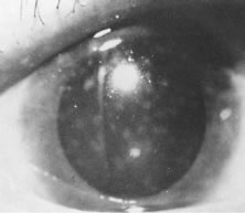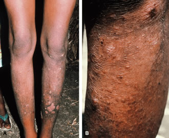 SKIN CHANGES The actual bite of the blackfly is usually unnoticed, although a painful wheal develops quickly and resolves in 2 or 3 days. Pruritus is the most common early manifestation of onchocerciasis. It develops after a latent or “prepatent” interval of 1 to 2 years following initial infection. During this time, the infective larvae mature into adult worms. Symptoms develop as microfilariae appear in the skin, and the prevalence of most types of onchocercal skin disease show statistically significant correlation with onchocercal endemicity. Itching and scratching may be mild and intermittent or severe and unremitting, in which case they often lead to excoriation and secondary infection, a syndrome complex widely known as “filarial scabies” (la gâle filarienne). A standard clinical method of classifying and grading the dermal changes of onchocerciasis has been developed20 and endorsed by World Health Organization (WHO) Expert Committee on Onchocerciasis Control.1 In long-standing and heavy infections, disfiguring skin lesions develop, the most common being a mottled depigmentation of the shins, known as “leopard skin” and generalized dermal atrophy. NODULES Onchocercal nodules are firm, round masses more commonly found around the pelvis in infected persons but also occur around the head and shoulders, especially in persons living in Central America. They may also be found on the lateral chest wall and in the limbs, where they are often fixed to the skin. New nodules tend to develop around older nodules. Although an individual nodule will usually be 0.25 to 1 cm in diameter and contain two or three females and one or two males, large matted conglomerations of nodules can form. Nodules are usually painless and, by themselves, cause little trouble. OCULAR CHANGES Intraocular Microfilariae The earliest sign of ocular involvement in onchocerciasis is the invasion of the eye by microfilariae. Microfilariae in the anterior chamber can be seen easily with a slit lamp, especially if a patient sits with his or her head between the knees for 2 to 5 minutes to allow any microfilariae in the anterior chamber to fall to the center of the cornea. When the patient sits up, the microfilariae are concentrated in one area behind the central cornea. The microfilariae are seen as small, wriggling white “worms.” They often can be followed as they circulate in convection currents in the aqueous. Live microfilariae can be more difficult to find in the cornea because they are far less mobile, almost transparent, and are often coiled. Dead microfilariae are more opaque and straighter and, therefore, much easier to see. Microfilariae are best seen with high magnification (×25) using retroillumination produced by an oblique beam reflected from the iris. They are most common in the peripheral cornea, especially temporally and nasally, but they may be found in the anterior vitreous or retina and, at times, attached to the lens capsule or to Descemet's membrane. Intraretinal microfilariae are best seen during contact lens examination of the fundus and appear as small, highly refractile objects with a greenish tinge.21 Punctate Keratitis In the cornea, dead microfilariae are usually surrounded by an inflammatory infiltrate that appears as an ill-defined punctate, fluffy, or snowflake opacity about 0.5 mm in diameter. These opacities are focal collections of lymphocytes and eosinophils with local edema.14,18 Although punctate keratitis sometimes occurs in persons who have not received treatment, it is more common in those receiving DEC treatment when many microfilariae die at one time (Fig. 9). Initially, dead microfilariae can be recognized in the center of these opacities. The opacities clear without visible sequelae. Sclerosing Keratitis With time, subtle changes begin at the limbus, initially in the interpalpebral fissure and inferiorly. These changes progress until ultimately the whole cornea is opaque and vascularized. An increased limbal translucency, or haze, is the earliest change. In time, a fibrovascular pannus and inflammatory infiltrate, composed mainly of lymphocytes and eosinophils, develops at the level of Bowman's membrane.14 This opacification advances in an arc, which is most marked at each side and below (Fig. 10). Usually, the remaining areas of clear cornea show heavy infiltration of microfilariae. The opacity progresses to cover the central cornea, and eventually the whole cornea may become opaque. Anterior Uveitis The presence and severity of anterior uveitis is extremely variable. A mild nongranulomatous uveitis with a minimum of flare and an occasional cell commonly occurs when there are microfilariae in the anterior chamber or the cornea. At times, however, the eye may be heavily infiltrated by microfilariae and yet have no detectable anterior chamber reaction, whereas in other cases a severe anterior uveitis may develop. When this occurs, inferior-posterior synechiae often develop, leading to a characteristic pear-shaped deformity of the pupil and retropupillary fibrosis. Chronic granulomatous anterior uveitis also causes a loss of the iris pigment frill and a pumice-stone appearance of the iris. Extensive synechiae may cause seclusion and occlusion of the pupil, secondary cataract, or secondary glaucoma. Mild uveitis has been related to the microfilarial invasion of the iris; the more severe granulomatous uveitis is related to invasion of the ciliary body.14,18 Chorioretinitis The great spectrum of fundal changes that is seen clinically seems to result from a few basic pathologic processes. Although numerous names and eponyms have been given to the different clinical pictures they present, it is simpler to consider the chorioretinal changes as these basic processes.15 Histopathologically, the retinal pigment epithelium may show areas of pigment migration atrophy or focal hyperplasia.21 Chronic nongranulomatous chorioretinitis occurs with infiltration by lymphocytes, pla