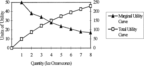 When some portion of those resources can be used to produce other goods and services, then the system is deemed to be operating at “technical efficiency.” When one has to increase the resources, one has to commit to a given venture, then one is said to be technically inefficient. “Allocative efficiency,” by contrast involves taking into account the concept of cost-effectiveness (CE), in which the decision taken is essentially an economically sound one. As such, allocative efficiency hinges on making appropriate value judgments about how to allocate resources. To assist us, the famous late-nineteenth century economist, Vilfredo Pareto, proposed that allocative efficiency is “attained when it is not possible to change the allocation of resources to make any one person better off without making at least one other person worse off.” Furthermore, one can identify two factors that modify or influence efficiency, namely (1) individual welfare, in which the individual decides which goods and services to consume, and (2) the available level and distribution of income in the economy. Hence, the Pareto criterion may be restated to read “that there is no unique allocation of resources such that there is only one allocatively efficient solution. Instead, there are a range of efficient allocations, one for each different combination of wealth and income.” Overall, the concept of the Pareto criterion is more theoretical than practical, since most changes in resource allocation have negative consequences and do, in fact, make certain segments of society worse off; that is, for any health policy change, there are both winners and losers. Essentially, health economics is concerned with discovering the best or most efficient means of allocating scarce healthcare resources to yield a given healthcare policy objective, such as reducing infant mortality, and so forth. The concept of equity or fairness significantly affects the decision to pursue various healthcare strategies or interventions and often is at odds with the concept of allocative efficiency. At this point, it is worth introducing the concept of “distributive equity,” since it forces decision makers to be concerned with where the final healthcare resources end up rather than how the resources are apportioned. In this respect, it is further useful to consider the twin concepts of horizontal and vertical equity in our dissection of the concept of distributive equity. Horizontal equity relates to the manner in which the scholars of the day believed that it was important to distribute an equal amount of goods and services to individuals who have similar economic circumstances. Under this view, the aim of efficiency is to achieve an equal distribution of healthcare resources to ensure that individuals with similar healthcare needs and costs obtain a similar amount on a per-capita basis. Vertical equity, by contrast, relates to the desire to distribute unequal amounts of healthcare resources among differently situated individuals in relation to the degree to which they are experiencing different healthcare situations. Thus, under this view, those segments of society with greater healthcare needs would receive a greater share of the total healthcare budget. The goal of health economics is to attempt to quantify the potential end users of such healthcare resources and so determine what sort of strategy is to be pursued, be it striving toward either horizontal or vertical equity. Traditionally, health economists have been guided in their attempts to allocate scarce resources efficiently to maximize an individual's human capital. However, the human capital approach, as it is known, is not without its detractors, since it fails to take into account a number of important factors. Sick and mentally or physically disabled persons are always undervalued in terms of economic productivity to the economy. In addition, the human capital approach fails to take into account such factors as the wage gap, especially between the genders and different ethnic groups. As a consequence, some economists have argued that days of healthy life gained through the introduction of a particular healthcare intervention or technique need to be weighted according to the, age, sex, and ethnic group wage rate for those persons who are affected.1 An equally fundamental principle of economics is the concept of “utility maximization,” in which each individual consumer seeks to derive as much satisfaction or happiness from the consumption of goods and services as possible. However, eventually, each consumer reaches a point at which he or she no longer derives the same degree of utility or satisfaction from the consumption of a given bundle of goods and services. The point beyond which individuals cease to derive increasing utility is called the law of diminishing marginal utility (Table 1 and Fig. 1). For example, consider the case of little Johnny eating an ice cream cone. After the first or second cone, Johnny's utility probably is still quite high; however, by the ninth or tenth ice cream cone, Johnny probably is feeling quite sick. Alas the law of diminishing marginal utility has a real-life example.