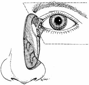 Postoperative management of the Pyrex tube is difficult in the pediatric age group but not impossible. Topical antibiotic drops are used four times per day for 2 weeks. In an adult, periodic syringing is easily done as an office procedure. In the pediatric age group, however, examination under anesthesia may be required to syringe adequately through mucus obstructions. The use of a contact lens wetting solution once daily is helpful in both pediatric and adult patients to reduce mucus formation. It is also helpful to instruct the patient to do the Valsalva maneuver by a quick inspiration with closure of the mouth and pinching both nostrils. In some instances, 10% N-acetylcysteine drops can be given several times daily. The mucolytic action of this agent sometimes will clear the tube. It is not harmful to the globe or adnexae, and obviously should be tried in the pediatric age group before subjecting a child to a general anesthetic. Patients should be instructed to close their eyes or hold a finger over the medial canthal region when they sneeze or blow their nose. Otherwise, the tube can dislodge, even when secured with a suture. If a tube is lost, it should be replaced as soon as possible. The channel can be dilated with gold dilators (Weiss, Gunther Weiss), and a new tube of appropriate length slipped in over a probe. A suture can be used for fixation, as previously described. ABNORMALITIES OF THE LACRIMAL SAC Early probing for mucoceles (amniotoceles) and for neonatal dacryocystitis was discussed earlier. These entities usually are seen at birth or in the immediate postpartum period.33,110 The anlage or supernumerary duct (Fig. 58) is another congenital abnormality of the sac. With a supernumery duct, tears drain directly onto the face if the upper portion of the nasolacrimal system is open. Repair of a supernumerary duct can be accomplished by first injecting a small amount of methylene blue through a lacrimal cannula into the duct to outline the mucosal lining down to the lacrimal sac. An appropriately sized probe is placed into the supernumerary duct. An ellipse of skin is resected conservatively around the probe. The duct is traced down to the lacrimal sac, where it is ligated and cut (Fig. 59). A layered closure of muscle and skin is done. This type of simple closure will prove to be sufficient if there is no lower block to tear flow in the nasolacrimal duct. If there is a lower system block, however, Silastic intubation of the nasal duct or DCR will be required to eliminate this problem.