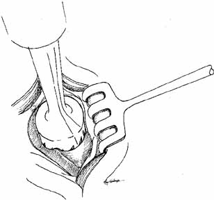 The postoperative care after balloon dilatation is the same as after probing and irrigation. A topical antibiotic–steroid ophthalmic solution is used four times daily for 1 week. Dacryocystorhinostomy STANDARD TECHNIQUE. If the more conservative procedures described above are unsuccessful, or if there is obvious bony obstruction below the lacrimal sac, a DCR must be performed.62 Local anesthesia can be used in adults by blocking the infratrochlear nerve, which can be accomplished by injecting several milliliters of a local anesthetic mixed with epinephrine in a ratio of 1:100,000. The effects can be enhanced by controlled sedation, which is of particular value in the elderly patient. Controlled hypotension is beneficial as well. The middle meatus should be packed with quarter-inch gauze tape or one-half × 3 inch patties soaked with oxymetazoline or 4% cocaine. This treatment will shrink the nasal mucosa and reduce hemorrhage as well. A reverse Trendelenberg position with the table tilted to 30 degrees (head up and feet down) and injection of a local vasoconstrictive agent are useful adjuncts for controlling bleeding. Positive pressure applied to the respiratory bag during general anesthesia also will reduce venous flow in the operative area. Controlled hypotension anesthesia provides the best hemostasis. Some surgeons use a small amount of diluted methylene blue instilled in the lacrimal sac through the punctum and canaliculus. This stain will outline the sac mucosa. However, if not sufficiently diluted, the stain can leak from the sac when cut, and cause confusion in differentiating anatomic layers (see Fig. 5). Usually, a straight vertical incision is made through the skin only over the nasal bridge, approximately 10 mm medial to the canthal angle. Caution is exercised to avoid the angular vessels that are located approximately 8 mm medial to the medial canthus. A medial lower lid crease incision or an extended subciliary blepharoplasty incision can be utilized if there are any cosmetic concerns. The vertical incision is preferable as it facilitates excellent visualization of the common internal punctum when the lacrimal sac is opened. Using the standard approach on the nasal bridge, the superior end of the incision should be placed just below the level of the medial canthal tendon. A straight incision on the nose reduces the chances of a postoperative bowstring scar, although several variations and modifications of this incision have been designed to eliminate this concern.80 With a number 15 Bard-Parker scalpel blade, the orbicularis muscle is then carefully incised down to the periosteum (Fig. 36). The angular vessels are retracted laterally with the orbicularis muscle by small rake retractors or a self-retaining retractor. If these vessels are cut, they should be cauterized or ligated to ensure visualization of the surgical field. The periosteum is incised with a scalpel blade and reflected laterally with a sharp periosteal elevator to the anterior lacrimal crest. The medial canthal tendon can be disinserted with the periosteum if wider exposure is needed later. Caution is required as the periosteum is lifted over the anterior lacrimal crest, where it is very adherent, so that the elevator does not tear through and enter the lacrimal sac. In the child, this crest is flat and the lacrimal fossa very shallow. Once over the periosteal attachment, at the crest, the lacrimal fossa is easily stripped free of periosteum. The periosteum is then retracted laterally to visualize the medial lacrimal sac wall. A hand trephine of 10 mm diameter (Arruga, Dixey Co., London, England) can be used to drill down to the nasal mucosa (Fig. 37). There are two trephines, one with a sharp central point and coarser teeth to engage the bone and create the initial cut (Fig. 38), and a finer toothed trephine that can be worked more gently down to the level of nasal mucosa. The surgeon cuts down perpendicularly to a sufficient depth and uses a sense of feel to rock the hand trephine back and forth, thereby fracturing the bone. The circle of bone can be removed with an Adson or other heavy forceps. It is peeled off of the nasal mucosa gently, with the use of a Freer periosteal elevator. A Stryker saw attachment, curved hemostat, Hall air drill, or mallet and osteotome are alternatives for gaining entrance through the bone to the nasal mucosa. The advantage of the hand trephine over the other methods is a controlled entrance to the nasal mucosa, which produces less chance of mucosal disruption and allows a sufficient opening for the use of bone punches.