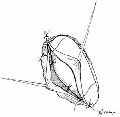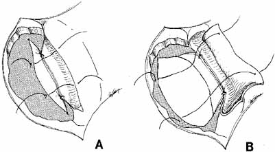 The periosteum anterior to the bony opening should be elevated from bone with a periosteal elevator for 2 to 3 mm to allow later suturing of the lateral edge of the periosteum with the medial canthal tendon back to its normal anatomic position. The nasal packing is removed to relax the mucosa, and the bony opening extended to about 15 mm in diameter, approximately thumbnail size (Fig. 39). The lacrimal sac is identified beneath the periosteal layer, which has been reflected laterally, by placing a blunt right-angle probe (Werb, Dixey Co., London, England)) or Bowman probe into one canaliculus to point up under the periosteum. The sac can be entered with a scalpel blade, by cutting directly over the probe, or preferably by cutting the sac with right-angle scissors (Werb). Cutting also can be done at the entrance of the sac to the nasolacrimal duct (Fig. 40). This step is facilitated by prior removal of the medial wall of the nasolacrimal duct. One blade of the scissors is passed into the opening created at the top of the duct, and the sac is divided from an inferior to a superior direction. The most important flaps are the anterior flaps from the sac and the nasal mucosa because the posterior flaps will fall together. The only concern with large posterior flaps is the creation of a posterior sac or nasal flap that is too large and might move out of position postoperatively occluding the common internal punctum where the canaliculi enter the sac. This problem is avoided with the use of short posterior flaps. Before incising the nasal mucosa, the surgeon removes the nasal packing and passes a small curved hemostat up to the nose to indent the mucosa and confirm that the space to be entered is actually in the nose and not in an anteriorly placed ethmoidal air cell. Nasal mucosal flaps are fashioned after incision of the mucosa from the inferior to the superior end of the bony opening. The width of the anterior flap is important; there must be an adequate flap to suture to the anterior flap of the lacrimal sac if this type of technique is used. The posterior flaps can be closed with interrupted 4–0 or 5–0 absorbable sutures on a semicircle needle, or they can be cauterized together.81,82 Closure of the posterior flaps usually is not necessary if the flaps are short and lie in near apposition. In this position, the flaps will not be able to occlude the internal common punctum postoperatively. An alternative method recommended by McCord6 is to create a large posterior flap of nasal mucosa by incising the nasal mucosa high and folding it down to meet a short posterior flap of lacrimal sac. The anterior flap is formed entirely of lacrimal sac. The incision into the lacrimal sac is made very posterior so that a large anterior mucosal flap is created; the flap can be sutured to the remaining anterior nasal mucosa or to periosteum at the end of the bony opening (Fig. 41). This method also is useful if the nasal mucosal flap has been damaged or inadvertently cut near the top of the bony ostium. The DCR also has been described without forming any flaps but we do not recommend this for the external approach.83