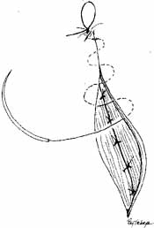 As for the monocanalicular stents, our preference is to use the Ritleng probe for passage. This hollow probe has a directed groove at the distal tip (Fig. 25A and 25B). The prolene portion on the Silastic tubing is fed down the probe and recovered from the nose (Fig. 26). Sometimes the directional groove will lead the prolene portion directly out the nostril. It is helpful to feed a majority of the prolene down the probe to facilitate distal recovery. The Ritleng hook, Crawford hook, or myringotomy forceps can be utilized to retrieve the prolene portion from the nose. If any trouble is encountered retrieving the prolene feeder, the surgeon should feel for the Ritleng probe and hook it. Once the hook is around the probe, the probe should be rotated 180 degrees because this will position the distal opening of the probe posteriorly. In addition, the probe should be slightly withdrawn. The hook will engage the prolene feeder when the hook is pulled anteriorly. It is important to note that the prolene thread has two portions, a light blue section and a dark blue section. The darker portion has a thicker diameter. When all the dark prolene has been inserted down the probe, the light blue, thinner portion should be passed outside the slit on the side of the probe. Simultaneously, the probe should be removed proximally from the nasolacrimal system.
