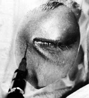 ABNORMALITIES OF THE PUNCTA AND CANALICULI (UPPER SYSTEM BLOCKS) Surgery of the punctum should be as conservative as possible. For simple congenital veils, gentle puncture followed by dilation and irrigation often will suffice. For greater degrees of atresia, however, injection of methylene blue into the lacrimal sac through the skin may be of value, particularly when the surgeon suspects that the canaliculus may be involved (Figs. 50 and 51). The surgeon can apply pressure over the lacrimal sac area and look for retrograde flow of dye through the lid margin. If the dye is not visible, an incision in the lid margin can be made in the area of the lacrimal papilla, if present. If the punctum is not present, an incision can be made approximately 8 mm lateral to the medial canthal angle (Fig. 52). If dye is visible, the channel is normal (Fig. 53). If suction of the nose reveals dye, the sac and duct are clearly patent, and a stent of Silastic tubing can be placed throughout the nasolacrimal system, as is done for dacryostenosis (Fig. 54). However, if there is obstruction in the lower system, a DCR will be necessary. Silastic tubing can be run through the entire upper and lower canaliculus and through a DCR opening.