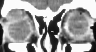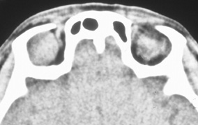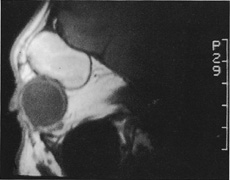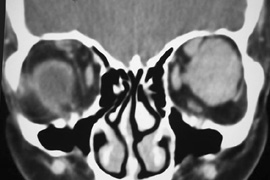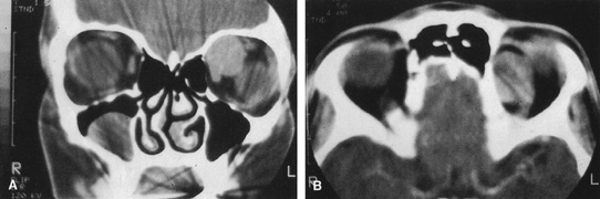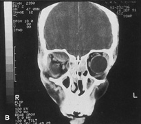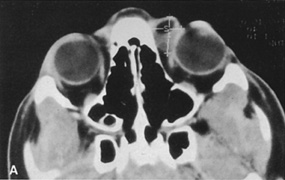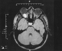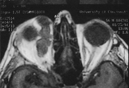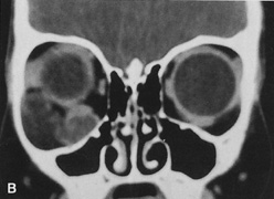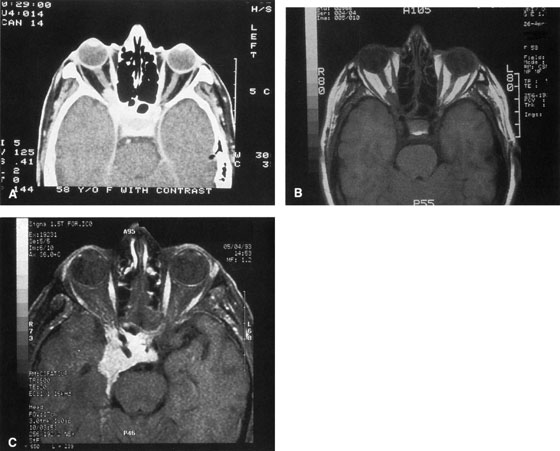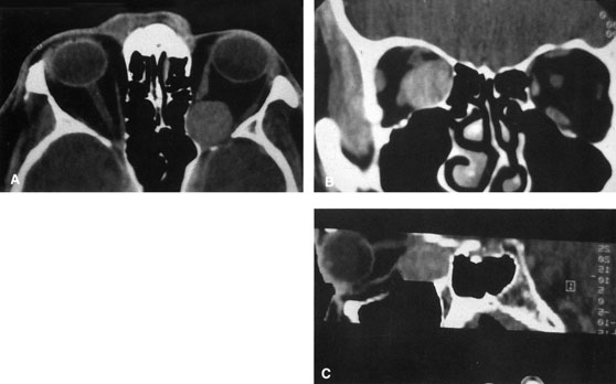 HISTORY AND PHYSICAL EXAMINATION A wide range of signs and symptoms may alert the ophthalmologist to involvement of the orbit by a pathologic process. These include proptosis or globe displacement; compressive optic neuropathy with visual field or visual acuity loss; refractive changes such as progressive hyperopia, restricted eye movements, and diplopia; optic disc changes, including pallor or edema; and fundus changes such as choroidal folds. These manifestations may be the consequences of a primary intraorbital disease or may occur secondary to involvement of the orbit by a process extending from the overlying soft tissues, periorbital sinuses, or intracranial cavity. All patients with suspected orbital pathology should have a thorough ophthalmic history and physical examination. Detailed questioning about the nature, onset, and progression of the chief complaint is necessary to formulate a differential diagnosis. Previous ocular and general medical history related to diseases, operations, medications, and family history should be obtained. A general review of systems will identify risk factors for related systemic diseases, such as hyperthyroidism, metastatic cancer, or lymphoma. A complete examination of the eye and periocular tissues is essential. Abnormal protrusion or displacement of the globe, extraocular motility disturbances, soft-tissue changes, and decreased corneal or periorbital cutaneous sensation should be specifically sought. Special attention always should be directed to evaluation of optic nerve function. Visual acuity testing alone is not sufficient because visual acuity often is preserved initially in patients with compressive optic neuropathy. All patients should be examined closely for detection of an afferent pupillary defect, abnormal color vision, or loss of contrast sensitivity. Formal perimetry should be performed to rule out peripheral field loss. If the presentation has been gradual, evaluation of old photographs may help establish the time course of the pathologic process. In selected cases, appropriate blood work to help identify orbital inflammatory or neoplastic processes also should be obtained. ORBITAL IMAGING Valuable information about the nature and extent of an orbital pathologic process is provided by imaging studies such as computed tomography (CT) scan, magnetic resonance imaging (MRI), and orbital echography. Better spatial resolution, ready accessibility, and lower cost make CT the preferred choice for orbital imaging in most cases. Orbital fat provides a natural contrast between most adjacent orbital structures on CT scanning, and orbital bones are visualized well. Computed tomography is essential for evaluation of the orbital bones because they cannot be imaged with MRI. Direct coronal or sagittal images are important to identify the relationship of a lesion to the optic nerve so that the surgical approach can be planned to avoid traversing the optic nerve (Fig. 1). Newer multislice helical CT scanners allow continuous acquisition of data so that a single rapid pass allows formatting in axial, coronal, and sagittal planes. Multislice CT provides shorter examination times with reduced motion artifact and radiation exposure when compared with conventional CT. Magnetic resonance imaging is useful in selected cases, especially when evaluating the orbital cranial junction. Significant bony artifact and a lack of orbital fat in the orbital apex make CT scan resolution of the orbital apex structures poor. Because cortical bone has low signal on MRI, there is no bone artifact when viewing the orbital apex on MRI. The lack of intervening fat in the apex to provide contrast is overcome on MRI because contrast is provided by the individual nuclear characteristics of each tissue so that the orbital apex structures are visualized well. Consequently, conditions that affect the optic nerve and chiasm, such as optic nerve meningioma and glioma, generally are evaluated with MRI rather than CT scan (Fig. 2). Use of a contrast agent such as gadolinium can further enhance the T1 signal intensity of lesions and is particularly helpful in imaging areas where there has been a breakdown in the blood–brain barrier. Because orbital fat produces a bright signal on T1-weighted images, orbital MR usually is performed with “fat suppression” to prevent masking of lesions. However, incomplete fat suppression can produce artifacts that may be misinterpreted as abnormal enhancement. A few other orbital conditions are better visualized with MRI than CT scanning.1–3 Often, organic foreign bodies, such as wood, are not imaged well with CT scan. These foreign bodies often are visible with MRI. However, care must be taken when imaging any metallic intraocular or intraorbital foreign body because the strong magnetic field of the MR scanner may cause the foreign body to shift position and damage surrounding structures. In some tumors and vascular anomalies, high blood flow is appreciated on MRI. This is caused by a lack of signal, known as a flow void, created by blood flowing rapidly through larger vessels. Tumors that originate in the brain and extend into the orbit secondarily, such as sphenoid wing meningioma, also are visualized well with MRI. However, bony detail and calcification within the meningioma are not imaged well. In unusual circumstances such as this, CT scan and MRI may prove to be complementary, and both techniques may be required to fully evaluate the orbital disease process. Orbital echography can provide useful information in the evaluation of orbital disorders. Because each tissue has its own acoustic characteristics, echography can provide a high degree of tissue contrast. Spatial resolution also is quite good. In some situations, echography can provide information not available on CT scan or MRI. These instances include detection and measurement of blood flow4 and intraoperative localization of small foreign bodies.5 Orbital echography requires speci