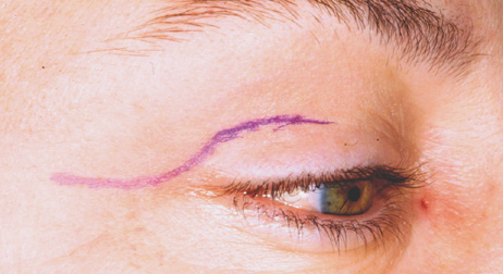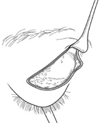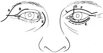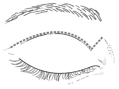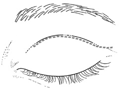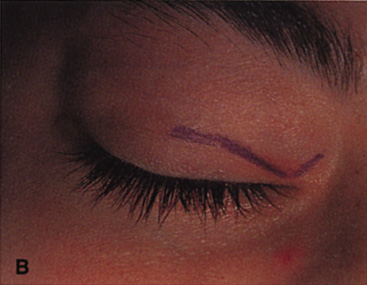 UPPER EYELID CREASE APPROACH Anterior lesions in the anterior superior orbit can be approached with incisions placed in the eyelid crease, within or beneath the brow, or through a coronal flap approach. The upper eyelid crease approach offers excellent scar camouflage and direct access with minimal undermining or dissection; it is preferable whenever possible. Because of the extreme elasticity and distensibility of the upper eyelid soft tissues, lid crease incisions allow ready access to the superior orbital rim, the peripheral superior orbit, and more superficial lesions overlying the medial and lateral orbital rims as well. Incisions placed within the brow or just below the brow are rarely performed because the supraorbital rim usually can be approached as easily with a lid crease incision. The eyelid crease approach for deep orbital lesions without bone removal is described in the preceding. Procedure The lid crease incision is marked at a point approximately 2 mm below the pre-existing lid crease because of the tendency for postoperative scar retraction to cause superior migration of the crease. For superomedial lesions, the incision medial to the punctum is angled superonasally toward the medial brow (Fig. 20). For lateral lesions, the incision beyond the lateral canthus can be directed superolaterally toward the tail of the brow (Fig. 21).