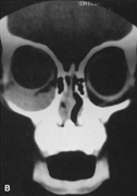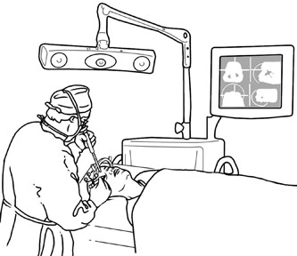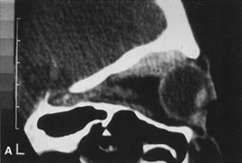 technique is fascinating and worthy of explanation. There are three steps in the image guidance process: (a) preoperative imaging, (b) intraoperative registration of anatomic landmarks with the scans, and (c) intraoperative navigation. Prior to preoperative imaging, markers (known as fiducials) are placed on the patient's skin, usually behind and above the ear. The position of the fiducials can be seen on the scans. In the operating room, the patient, the probe and the computer are linked in the registration process. A “camera” linked to the computer “sees” the probe as the surgeon touches a fiducials on the patient with a probe. The exact three-dimensional position of the probe is recorded in the computer. The registration process continues in a similar manner, linking each fiducial on the patient with its position on the computer image. Additional registration points are linked using anatomic landmarks such as the tragus. The more points that are registered the higher the accuracy of the subsequent navigation. The operation proceeds in normal fashion. When confirmation of the location of any anatomic structure is desired, the probe is placed into at that position, the camera “sees” the probe, and the computer shows the position of the probe on the monitor (Fig. 4). Different probe configurations allow simultaneous positioning of more than one probe. It is possible to use a drill or suction catheter as a probe so that the intraoperative position of these devices can be visualized while being used. The accuracy of intraoperative navigation can be in the submillimeter range if high-resolution scans and accurate registration are used. Functional endoscopic sinus surgery and skull base operations are examples of procedures in which complex anatomy exists, often with variation from patient to patient or even side to side. Disease processes such as tumors or polyps can distort the anatomy as well. In these cases, the time spent in setting up the equipment and registering the system can be worthwhile. Surgical navigation has been used in orbital surgery, especially intraorbital foreign body removal or those orbital cases involving combined sinus and intracranial approaches. No doubt new innovations in imaging and computer technology will expand the uses of image guidance systems. |