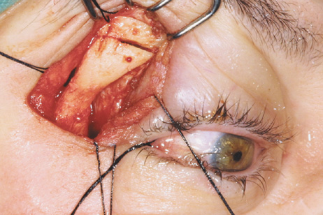 Procedure The lateral canthotomy is made with straight iris scissors or a No. 15 blade, and the unipolar cautery then can be used to extend the incision deeply through orbicularis to expose periosteum along the length of the lateral rim (see Fig. 11A). The periosteum is opened vertically along the length of the rim, and large periosteal elevators are used to elevate the periosteum superiorly and inferiorly to completely expose the bony lateral rim. The inferior and superior crura of the lateral canthal tendon generally are left attached to the periosteum during dissection. If further exposure is needed, they can be sharply disinserted. Once the bony lateral rim has been fully exposed, the subsequent steps are otherwise identical to the eyelid crease approach as described. At the completion of the procedure, the lateral canthus is reapproximated with a single double-armed absorbable suture passed through the superior and inferior crura of the lateral canthal tendon (see Fig. 12). It is not necessary to refixate the canthus to the periosteum except in older patients with pre-existing significant lower lid laxity. The skin is then closed with one or two interrupted absorbable sutures. If a drain is required in the temporal fossa, it can be brought out through a separate stab incision posterior to the canthotomy or at the posterior edge of the canthotomy incision. Indications The majority of lateral orbital lesions can be approached with this limited skin incision. However, very large tumors, apical orbital lesions, and lacrimal fossa lesions requiring periosteal removal and a wide field (e.g., benign mixed tumors of the lacrimal gland; see Fig. 8) are better approached with a more extensive eyelid crease incision Transcoronal Lateral Orbitotomy Access to the lateral orbital wall also can be achieved through an extended incision placed at or behind the hairline in the scalp.14,15 The incision is carried full-thickness through skin and subcutaneous tissue down to pericranium, and dissection then is carried forward deep to the galea aponeurotica and frontalis muscle to expose the lateral orbital rim and overlying temporalis muscle. Raney clips may be used to tamponade bleeding vessels along the extended scalp incision. Inferior extension of the coronal incision to the preauricular area usually is required to sufficiently relax the coronal flap to allow exposure of the lateral rim. The temporalis muscle must be disinserted along its anterior and superior origin and retracted extensively so that the usual osteotomies can be made through the lateral rim. Once the rim has been exposed, osteotomies and bone removal are performed. Indications This approach provides access for removal of the lateral wall and access to lateral orbital lesions. It has several disadvantages, however. It requires a lengthy incision and extensive undermining with increased potential for blood loss. Although it provides excellent scar camouflage in patients with an intact hairline, the potential for male-pattern hair recession makes it less satisfactory in male patients. There is also the possibility of damage to the seventh cranial nerve if the dissection plane strays too superficially over the temporalis muscle. Extensive elevation and retraction of the temporalis muscle usually are required, and this may be associated with cosmetically objectionable temporalis atrophy in the postoperative period. Although the coronal approach is ideal for lesions requiring removal of the orbital roof or extensive bony reconstruction of the superior orbital rim, it is rarely indicated for routine lateral orbitotomy, where upper eyelid crease or lateral canthotomy incisions leave a virtually imperceptible scar while avoiding these complications TRANSCRANIAL ORBITOTOMY The superior orbit can be approached through a number of orbitotomy incisions; however, the orbital apex, intracanalicular optic canal, and chiasmal region may be adequately exposed only with use of a transcranial orbitotomy. An anterior orbitotomy through the upper lid may be used for the anterior one-half of the superior orbit. A lateral orbitotomy with bone removal gives exposure of the lateral superior orbit, but the nerves and vessels in the superior orbital fissure limit the extent of the posterior exposure. A frontoethmoidal or transcaruncular incision with removal of the ethmoid sinus gives a limited view of the orbital apex. Only a transcranial orbitotomy provides extensive exposure of the orbital apex, especially superior and medial to the optic nerve. Procedure The transcranial orbitotomy uses a frontal craniotomy with removal of a portion of the orbital roof to expose the orbital apex or superior orbit. This is best performed by a neurosurgeon familiar with skull-base surgical approaches. In most cases, the supraorbital rim over the involved side is removed en bloc with the frontal bone flap (Fig. 13). The anterior one-half or two-thirds of the orbital roof breaks free with removal of the rim and frontal bone flap, and the remaining posterior portion of the roof can be removed with rongeurs. Historically, it was suggested that all orbital tumors be removed via craniotomy, because before the imaging era it was difficult to anticipate the intraorbital location of a mass.18 The transfrontal approach was first described by Jones10 in 1970. Jane and colleagues19 proposed the current technique in 1982. Refinements have been discussed by Maroon and Kennerdell9 and Housepian.20 This operation has been termed the panoramic orbitotomy by Rootman21 because of the wide area of exposure offered by this procedure.
