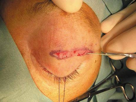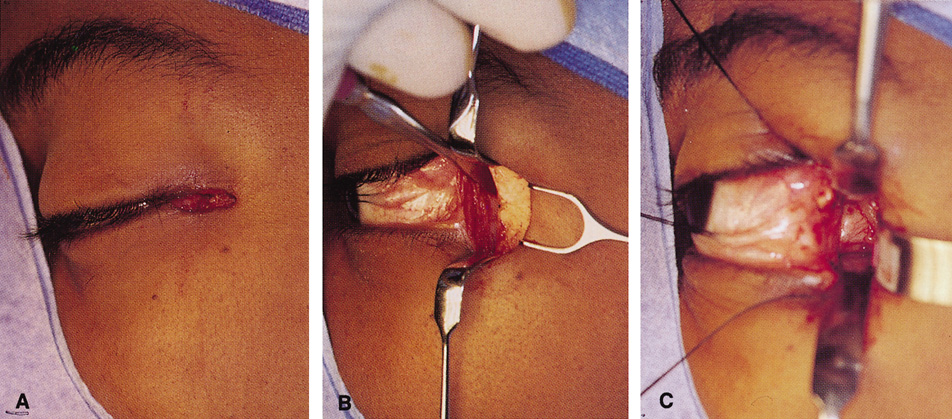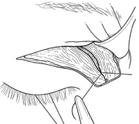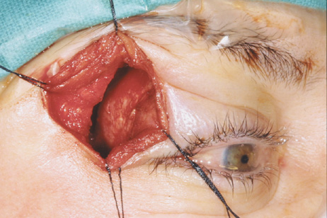 VERTICAL-LID-SPLIT SUPERIOR ORBITOTOMY The upper eyelid crease incision gives excellent access to the peripheral superior orbital space. However, lesions that lie intraconally are difficult to approach with a transverse lid crease incision as dissection must be performed medial to the medial horn of the levator muscle to avoid transecting and disinserting the levator aponeurosis and Müller's muscle. However, vertically splitting the upper lid allows a vertical separation of the levator aponeurosis and Müller's muscle and does not disinsert it from its normal insertions on the tarsal plate. This approach provides an excellent exposure of the superomedial orbit and is useful for approaching lesions that lie medial to the optic nerve.26 In this situation, it is often an attractive alternative to a transcranial superior orbitotomy, which might otherwise be required (Fig. 25).