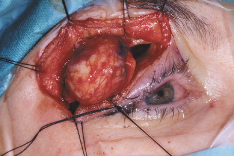 A lid fixation suture is placed through the marginal tarsus and clamped to the drape below. This stabilizes the lid and makes identification of the appropriate dissection plane much easier. The skin is incised, and dissection is carried through the underlying orbicularis to the postorbicular fascial plane. This plane overlies the orbital septum and levator aponeurosis, and dissection superiorly in this plane keeps the orbital septum intact. Dissection in the postorbicular plane allows ready access to the superior orbital rim and good exposure of both extraperiosteal and anterior peripheral intraorbital lesions. If a lesion is extraperiosteal, the periosteum overlying the orbital rim is incised and the extraperiosteal space is entered and the periorbita elevated (see Fig. 21D). Care must be taken to locate the supraorbital foramen or notch along the superomedial orbital rim to avoid damage to the neurovascular bundle. Lesions that lie within the peripheral orbital space require opening of the orbital septum and dissection superficial to the levator aponeurosis. Once the orbital dissection is completed, skin closure is carried out with a running cutaneous absorbable suture. The orbital septum should never be sutured closed because this might result in foreshortening of the septum with resultant lagophthalmos. There is no need to reform the lid crease by fixating subcutaneous tissues to the levator aponeurosis. The lid crease naturally reforms around the incision and dissection plane, and aponeurotic fixation may cause superior migration of the postoperative lid crease. Indications The upper eyelid crease approach allows excellent access to lesions in the superior orbit at or anterior to the equator of the globe. Encapsulated lesions deep within the orbit often can be removed through this anterior approach provided their superficial surface extends anterior to the equator of the globe (Fig. 22). The lid crease incision also allows simultaneous exposure and surgery on the underlying levator aponeurosis when necessary. This approach has also proved useful in approaching superficial dermoid cysts overlying the medial and lateral orbital rims.23,24
