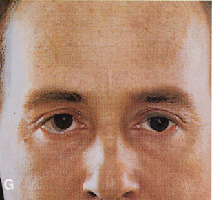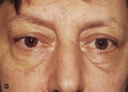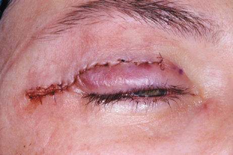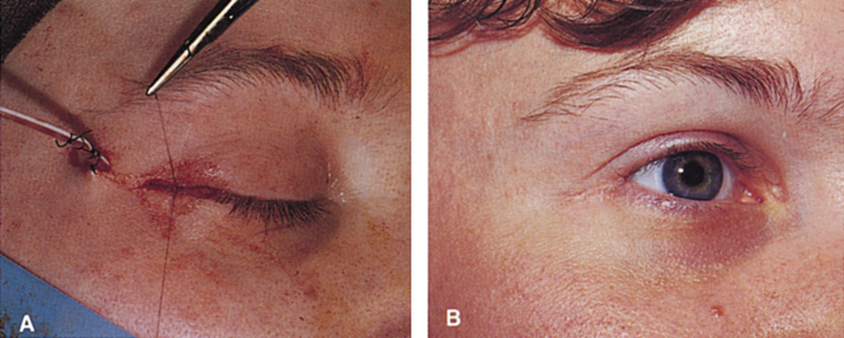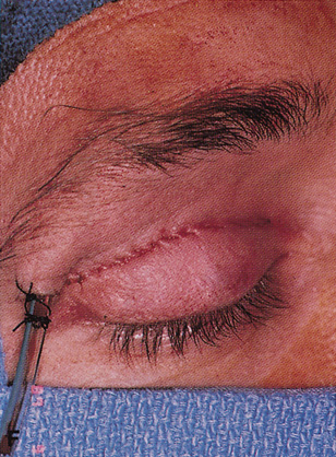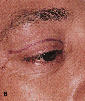 After removal of the lesion, repair is carried out in a fashion identical to that used for repair of a lid marginal laceration. The bulbar, fornix, and palpebral conjunctiva are reapproximated and the tarsal plate meticulously realigned at the lid margin with a vertical mattress 7-0 Vicryl suture. Additional sutures to realign the lash line are followed by closure of the orbicularis and skin. Indications This approach allows for excellent scar camouflage with maintenance of appropriate lid height and contour. It is useful for exposure of superior orbital lesions that lie medial to the optic nerve (see Fig. 26G, H). Well-encapsulated peripheral and intraconal lesions posterior to the globe may be reached fairly readily with this approach. |