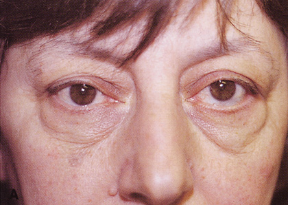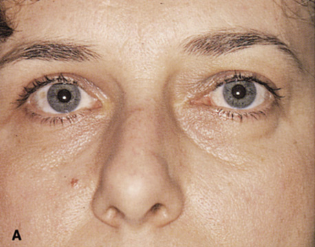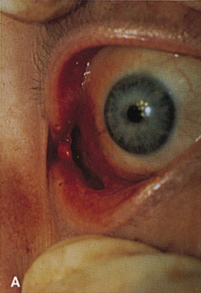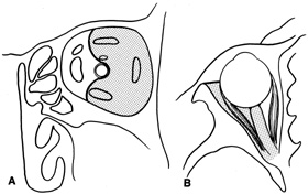 Indications The most common use of the transconjunctival orbitotomy is to expose the anterior portion of the peripheral extraocular muscle and intraconal spaces. In particular, the optic nerve can be biopsied or fenestrated by use of this approach. When exposure is too limited to safely biopsy deep intraconal masses, transconjunctival orbitotomy can be combined with a lateral orbitotomy with bone removal. This allows the eye to be shifted laterally, making more room to work in the medial orbit (see Fig. 27B). The transconjunctival medial orbitotomy can be extended vertically into the upper lid, as mentioned, to provide exposure of the superonasal quadrant FRONTOETHMOIDAL MEDIAL ORBITOTOMY A frontoethmoidal incision or transcaruncular incision can be used to enter the anteromedial extraperiosteal space without performing bone removal along the medial wall. These approaches are discussed under Deep Medial Orbitotomy. |