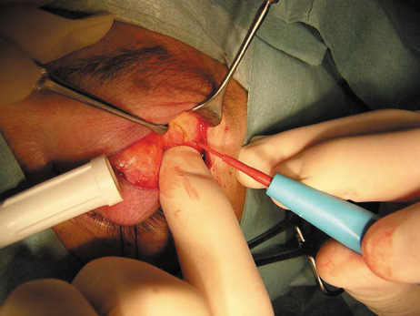 In the case of more deeply placed superior orbital lesions, it is possible to use an air drill to burr away the superior orbital rim to provide better exposure and allow deeper access in the superior orbit (Fig. 24). Because the contour of the brow is established by the supraorbital ridge, fairly extensive removal of the superior orbital rim can be carried out without cosmetic deficiency. However, care must be taken to identify the supraorbital nerve and avoid damage to it during this maneuver, or hypesthesia over the forehead and scalp can result. The amount of bone removal also is limited by the degree of pneumatization of the overlying frontal sinuses, although inadvertent entry into the sinus usually is not a problem as long as the nasofrontal duct is not compromised.