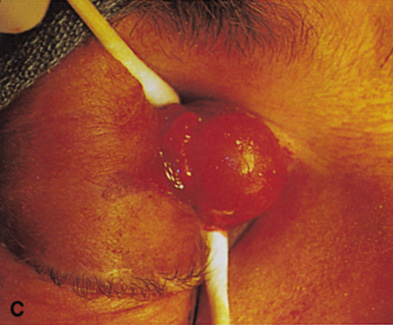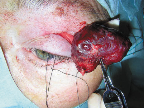 be brought under optimal medical control in the preoperative period. Once in the operating room, the patient should be placed in the reverse Trendelenburg position to decrease venous pressure. The patient's blood pressure should be strictly controlled in most cases, with the goal of maintaining the blood pressure at or slightly below the patient's normal range. In patients with particularly vascular tumors, consideration should be given to hypotensive anesthesia with placement of an intra-arterial blood pressure monitor. The vasoconstriction provided by the dilute epinephrine (1:100,000 to 1:200,000) mixed with local anesthetic helps to prevent bleeding when 1 or 2 ml is injected 10 minutes before incision. Small vessels are coagulated with bipolar cautery. When the surgeon is working away from the eyelids or orbit, unipolar cautery may be used to cut or coagulate the bleeding vessels. In general, unipolar cautery should not be used within the confines of the orbit because it may preferentially conduct along myelinated nerve fibers. When large arteries are encountered, aneurysm clips may be applied. Long-handled bayonet microsurgical bipolar cautery instruments are available for intraorbital and intracranial coagulation. Visualization is improved with Q-tips or “peanut” type gauze dissectors to absorb small amounts of blood on the field. When bleeding is more vigorous, suction may be required to visualize bleeding vessels. Suction is facilitated by placing the suction tip against a cottonoid rather than on the orbital fat. Specialized suction tips are useful in the sinus. These suction devices may include irrigation or unipolar cautery. Bone wax, Gelfoam (absorbable gelatin sponge), Surgicel (oxidized regenerated cellulose), Avitene (microfibrillar collagen), and Thrombogen (thrombin) also are available to facilitate coagulation. In most orbitotomy cases, blood products are not required. In some cases where tumor resection involves other parts of the cranium or face, blood replacement may be required. In cases where resection of particularly vascular tumors is necessary, preoperative angiography with arterial embolization may be helpful. If there is concern about postoperative bleeding, a flexible vacuum drain may be used. Atraumatic extubation of the patient at the completion of the procedure is important to prevent increased venous pressure, which increases the risk of orbital hemorrhage. |