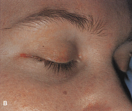 After the periorbita has been elevated internally, and the periosteum reflected laterally and superiorly to completely expose the lateral rim, a large malleable retractor is placed between the orbital contents and the mesial surface of the lateral orbital rim. This protects the orbital contents while an air-driven saw is used to make two osteotomies. One is placed superiorly about 0.5 cm above the zygomaticofrontal suture. Aligning the saw blade toward the upper molars on the opposite side (an angle of 45°) produces a wide opening while avoiding inadvertent entry into the overlying frontal cranial fossa by the saw blade. Finger palpation of the orbital roof beneath the brow reminds the surgeon of the location of the frontal lobe and helps ensure that the saw is not angled in a fashion to allow intracranial penetration. A second osteotomy is made inferiorly through the lateral rim just adjacent to the floor of the orbit above the zygomatic arch. The osteotomies may be shifted superiorly or inferiorly depending on the exact location of the orbital lesion, but an opening in the lateral wall of 2.5 to 3 cm is desirable. After the saw cuts have been made, a wire-passing drill bit is used to preplace drill holes above and below each of the two osteotomies so that the bone can be refixated at the completion of the procedure. Care is taken again to angle the superior drill hole to avoid intracranial penetration and to protect orbital contents with a wide malleable retractor. The lateral rim is out-fractured with large rongeur by gently “rocking” the rim outward, and remaining strands of temporalis muscle at the posterior edge of the bone fragment may be cut with the unipolar cautery. The rim is removed and placed off the field in moist gauze. Great care is taken to avoid inadvertent contamination of the lateral rim as it will be replaced at the end of the procedure. After out-fracture of the lateral rim, the thinner bone behind the rim can be removed with a rongeur to provide better access to the orbital apex. Bone removal usually is carried posteriorly to the pterion, the thicker wedge of cancellous bone that constitutes the body of the greater wing of the sphenoid. Hemorrhage from the cancellous bone may be brisk and may require tamponade with bone wax for control. The temporalis fascia is retracted posteriorly with broad malleable retractors so that the apical periorbita can be exposed. Relaxing incisions can be made with the unipolar cautery through the superior temporalis muscle if it is difficult to adequately expose the apex. The lateral rectus muscle and lacrimal gland lie just beneath the periorbita along the lateral orbit (see Fig. 6F), and damage to these structures is avoided by opening the periorbita with blunt-tipped scissors. A traction suture placed transconjunctivally beneath the insertion of the muscle can be manipulated to help identify the belly of the lateral rectus posteriorly in the orbit. A longitudinal periorbital incision beginning anteriorly and extending back to the orbital apex will allow extensive retraction of the periorbita. Additional vertical relaxing incisions through the periorbita may be made anteriorly. The periorbita is retracted, and the lateral rectus muscle and lacrimal gland are identified. If the lesion lies in the intraconal space, sharp dissection to release the intermuscular septum, either above or below the lateral rectus muscle, is usually required to gain access to the retrobulbar space. Sewall orbital retractors provide retraction of the lacrimal gland and lateral rectus muscle. Depending on the location of the lesion superiorly or inferiorly within the orbit, dissection is carried out above the superior border or below the inferior border of the retracted lateral rectus muscle. Deep orbital dissection requires fiberoptic illumination and loupe magnification at a minimum, and often it is best performed with the operating microscope to aid in identification of the vital vascular and neural structures within the orbit. After removal or biopsy of the proposed lesion, the orbital rim is reinserted and fixated with sutures passed through the predrilled holes, or with rigid screw and microplate fixation (see Fig. 6H). Usually it is not necessary or desirable to close the periorbita because this allows for decompression of any postoperative retro-orbital hemorrhage into the temporal fossa. After the bone has been resutured in place, the anterior cut edges of periorbita and periosteum along the lateral rim may be loosely reapposed over it to prevent the overlying orbicularis-skin flap from adhering to the bare bony rim. The eyelid crease incision can be closed with a running suture (see Fig. 6I) as one would after upper blepharoplasty. A drain may be placed in the temporal fossa and brought through the lateral aspect of the incision or through a separate stab wound and connected to external suction for the first 24 hours postoperatively if there is any question about complete hemostasis. Indications Lateral orbitotomy provides excellent access to deep lesions in the subperiosteal, peripheral, or intraconal space lateral to the optic nerve (Fig. 8A, B).